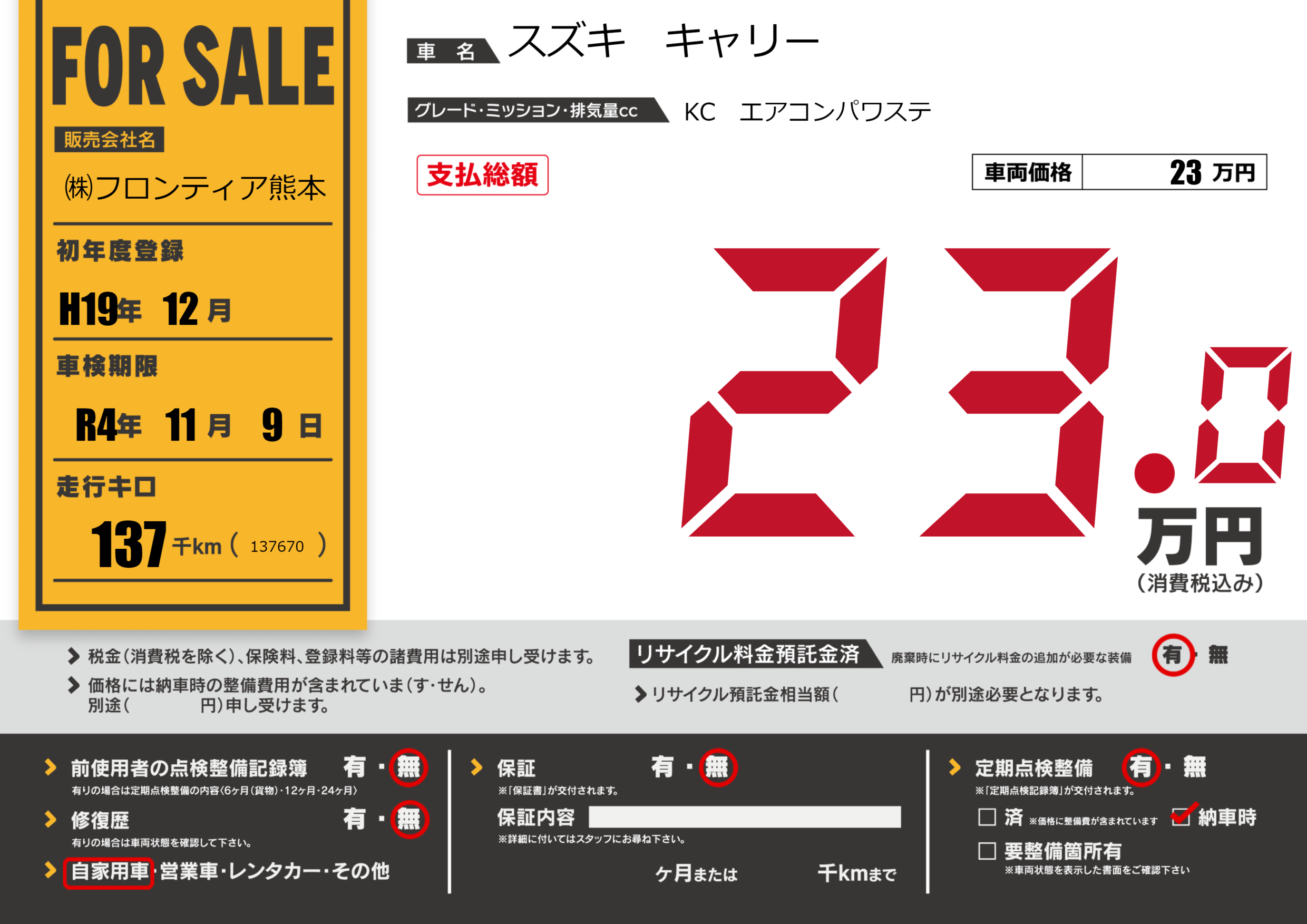 | 走行キロ | 13.7万km | 初年度登録 | H19年12月 |