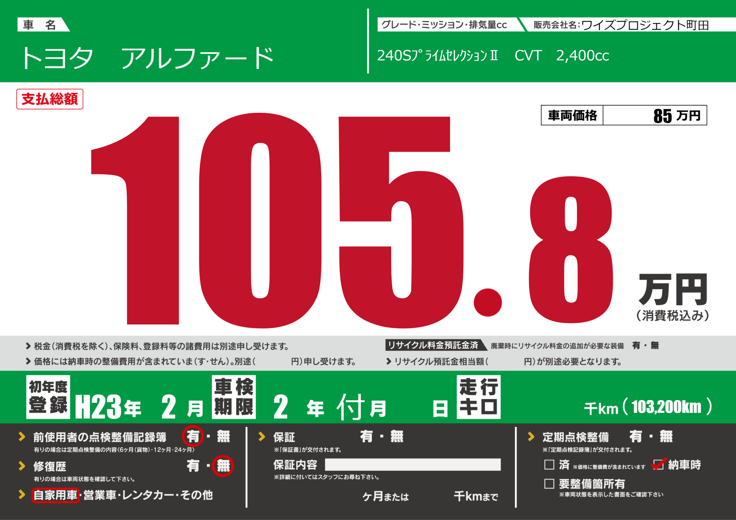 | 車名 | トヨタ アルファード | グレード ミッション 排気量 |