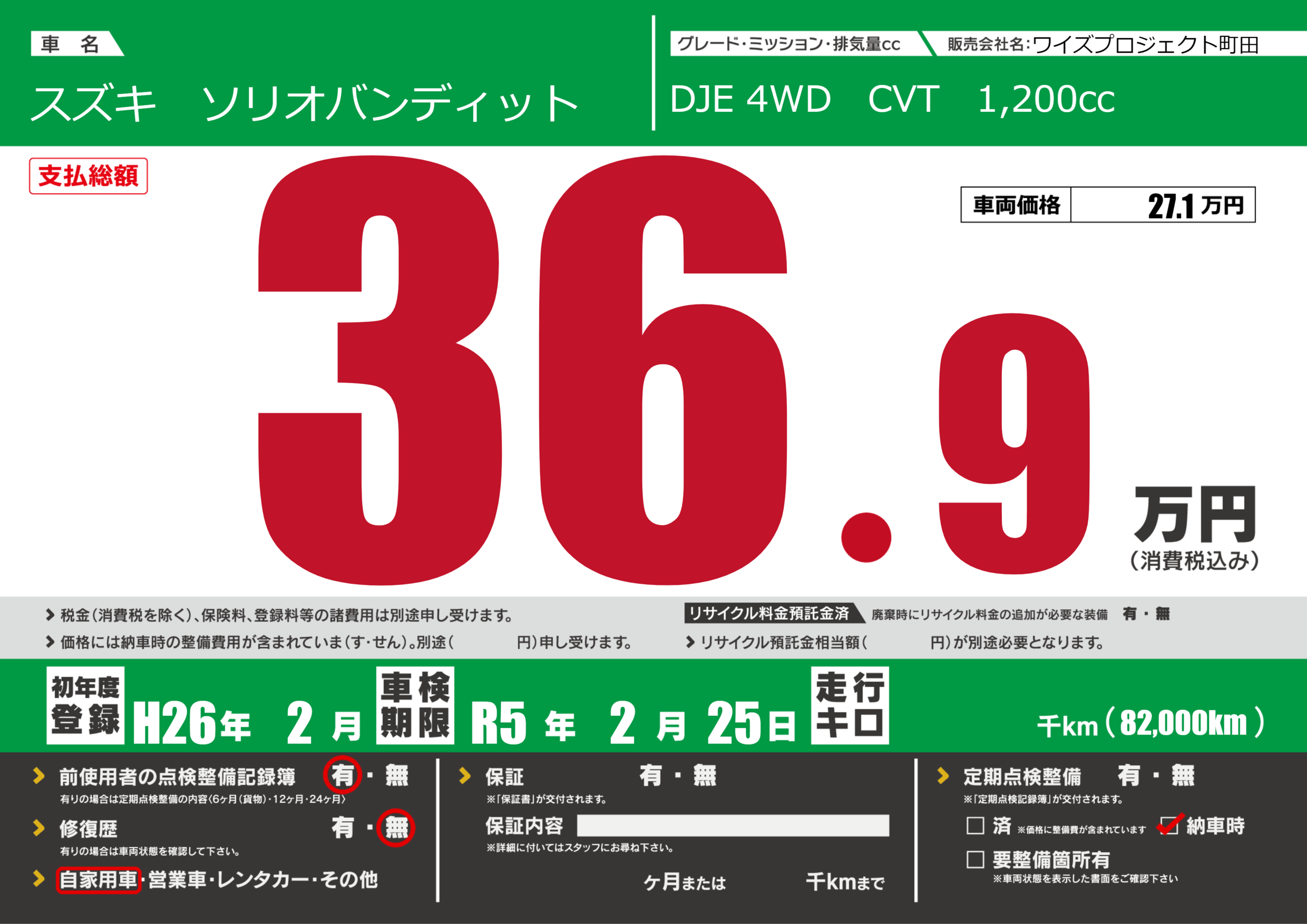 | 車名 | スズキ ソリオバンディット | グレード ミッション 排気量 |