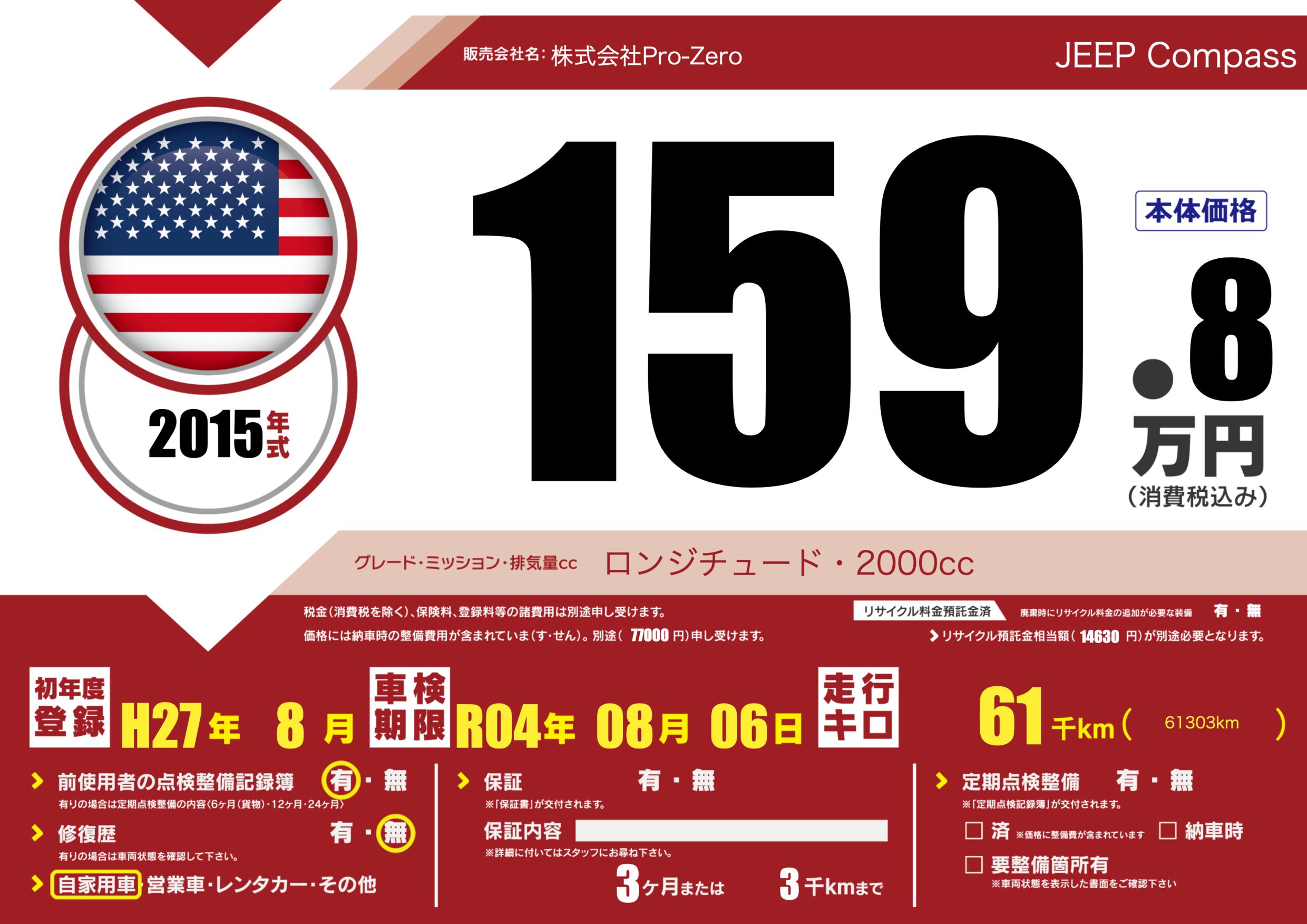 | 車名 | JEEP Compass | グレード ミッション 排気量 |