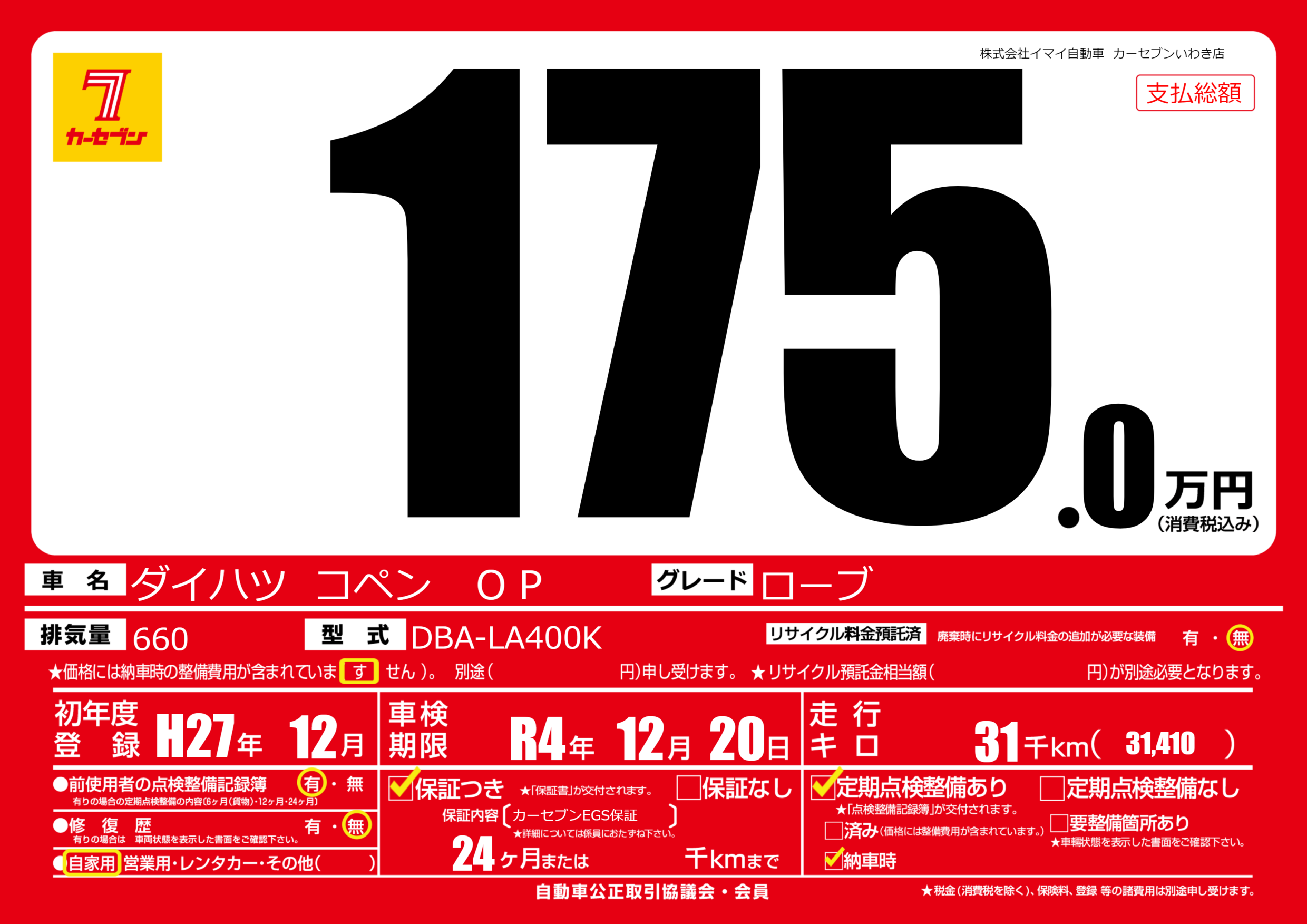 | 車検制限 | R4年 12月 20日 | ||