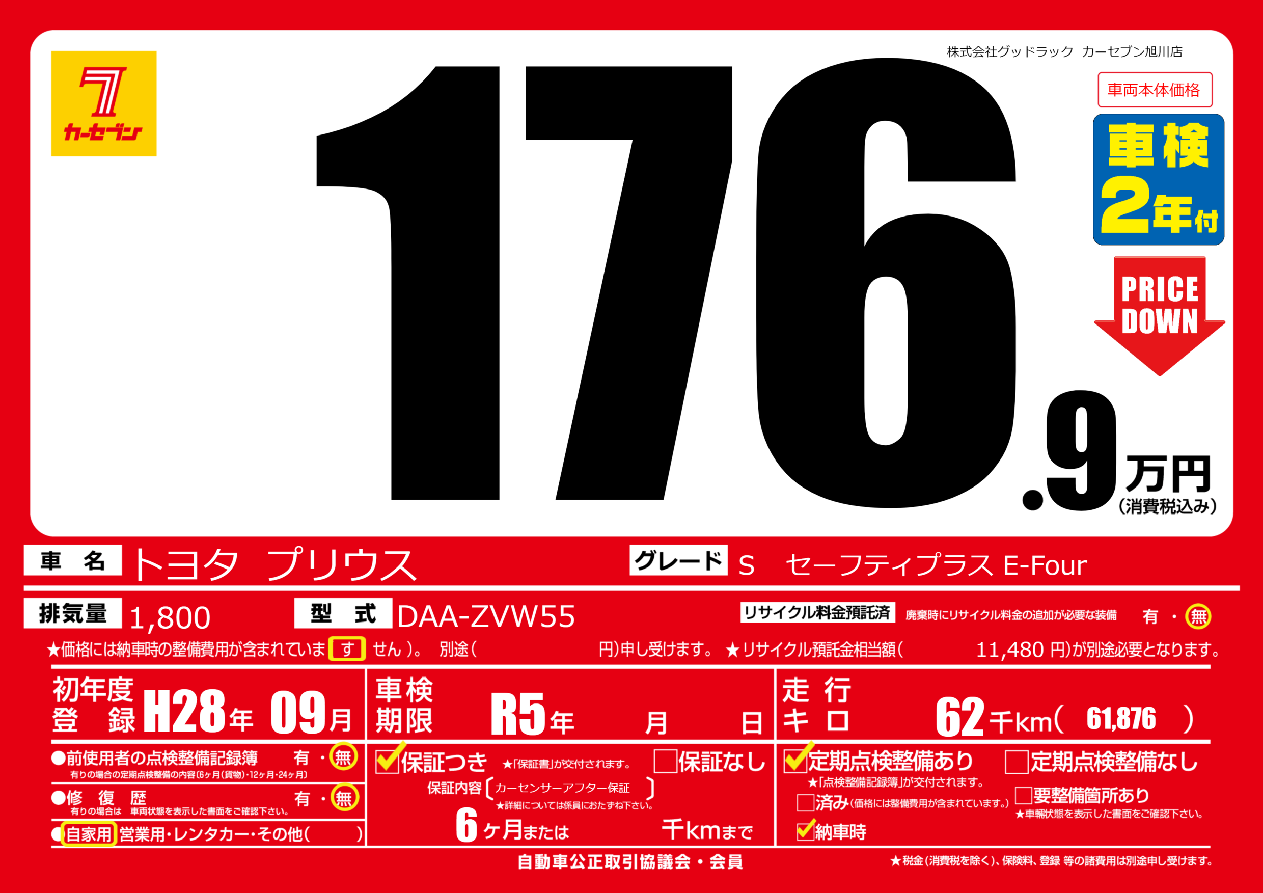| 車名 | トヨタ プリウス | グレード ミッション 排気量 |