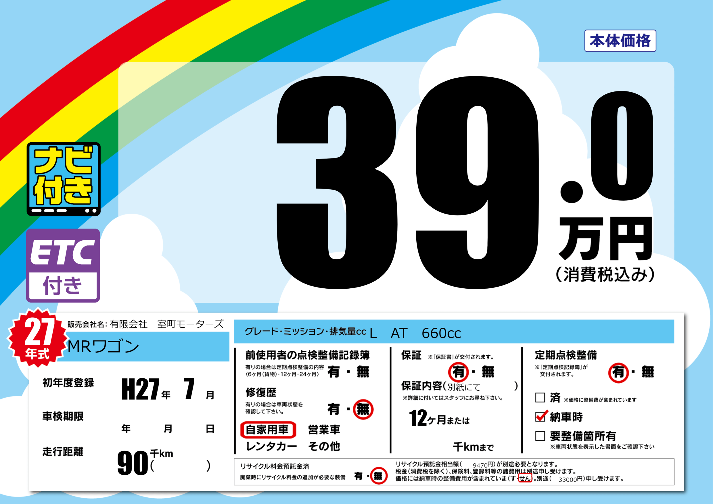 | 車名 | MRワゴン | グレード ミッション 排気量 |