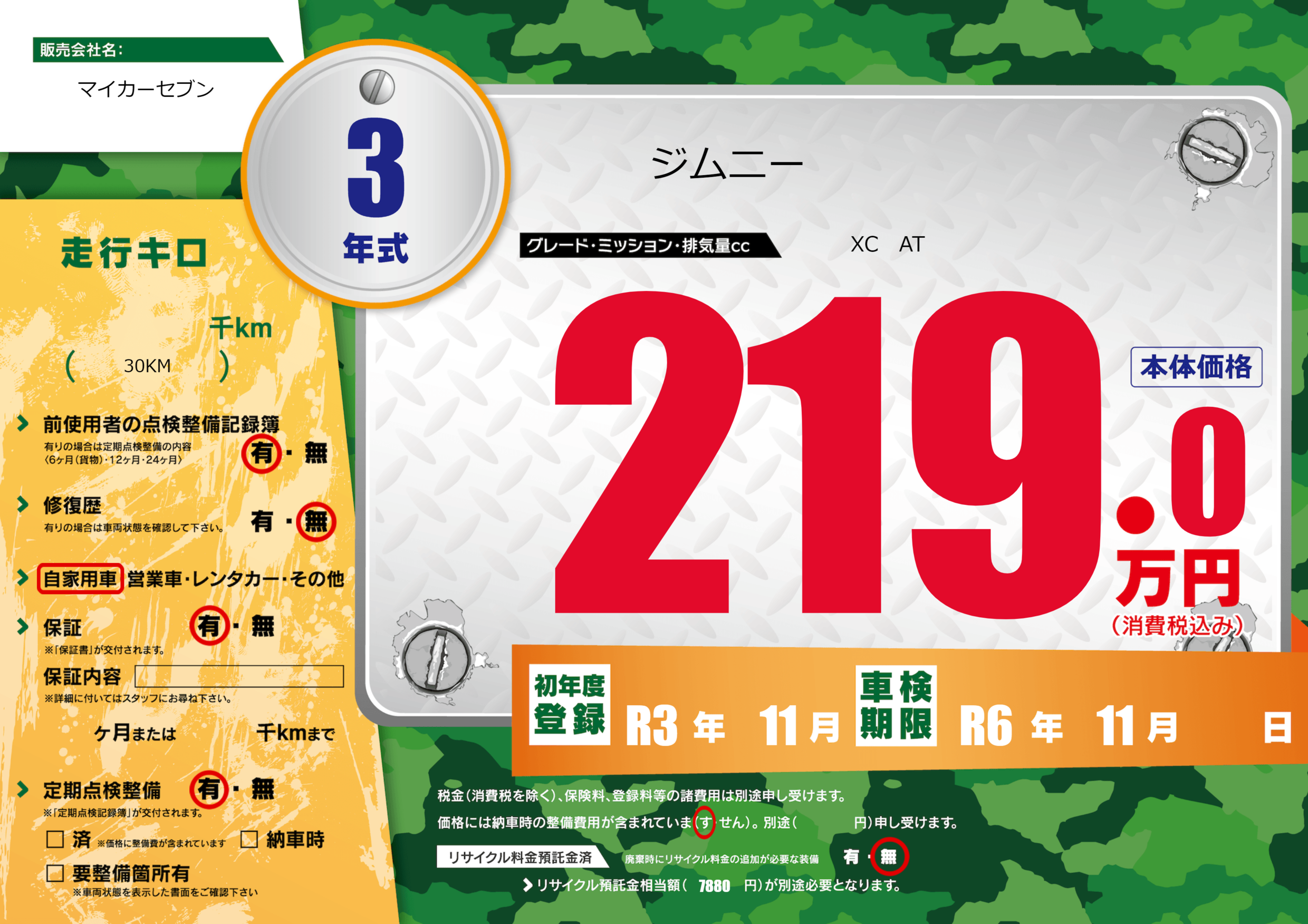 | 車検制限 | R6年 11月 - 日 | ||