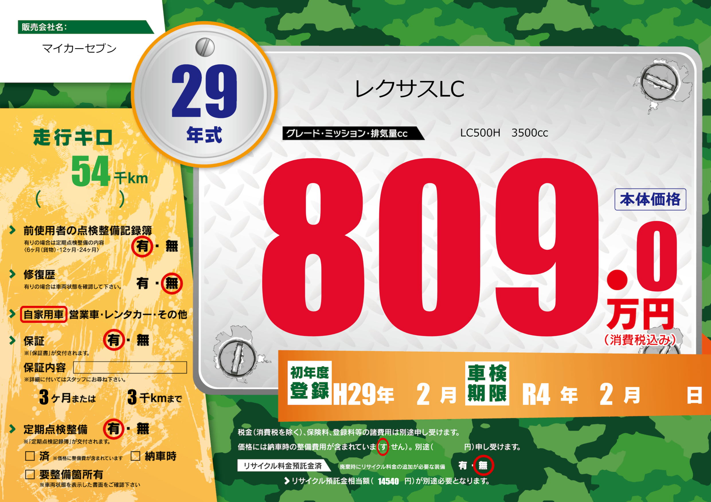 | 車名 | レクサスLC | グレード ミッション 排気量 |