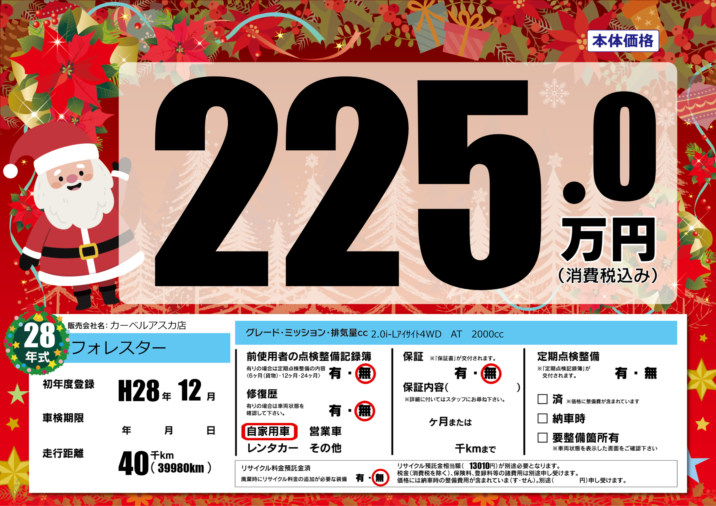 | 走行キロ | 4万km | 初年度登録 | H28年12月 |