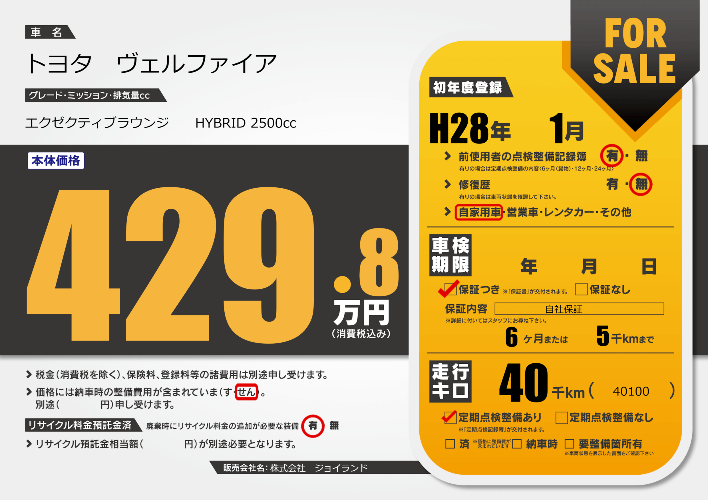 保証付き 保証内容( 自社保証) 6ヶ月または(5)千kmまで |