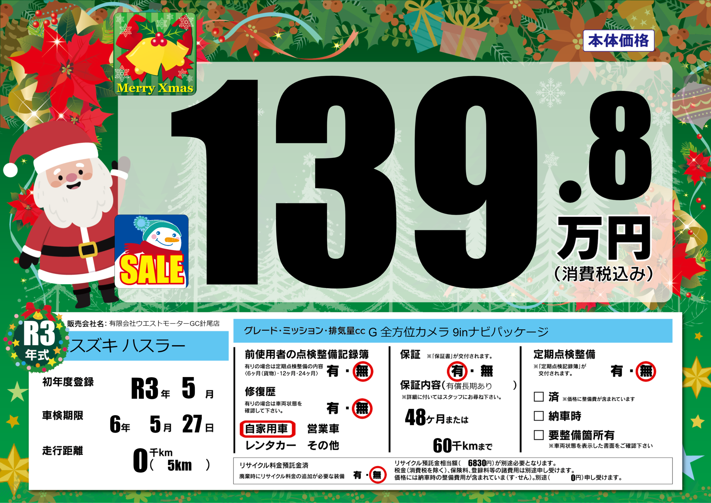 | 車名 | スズキ ハスラー | グレード ミッション 排気量 |