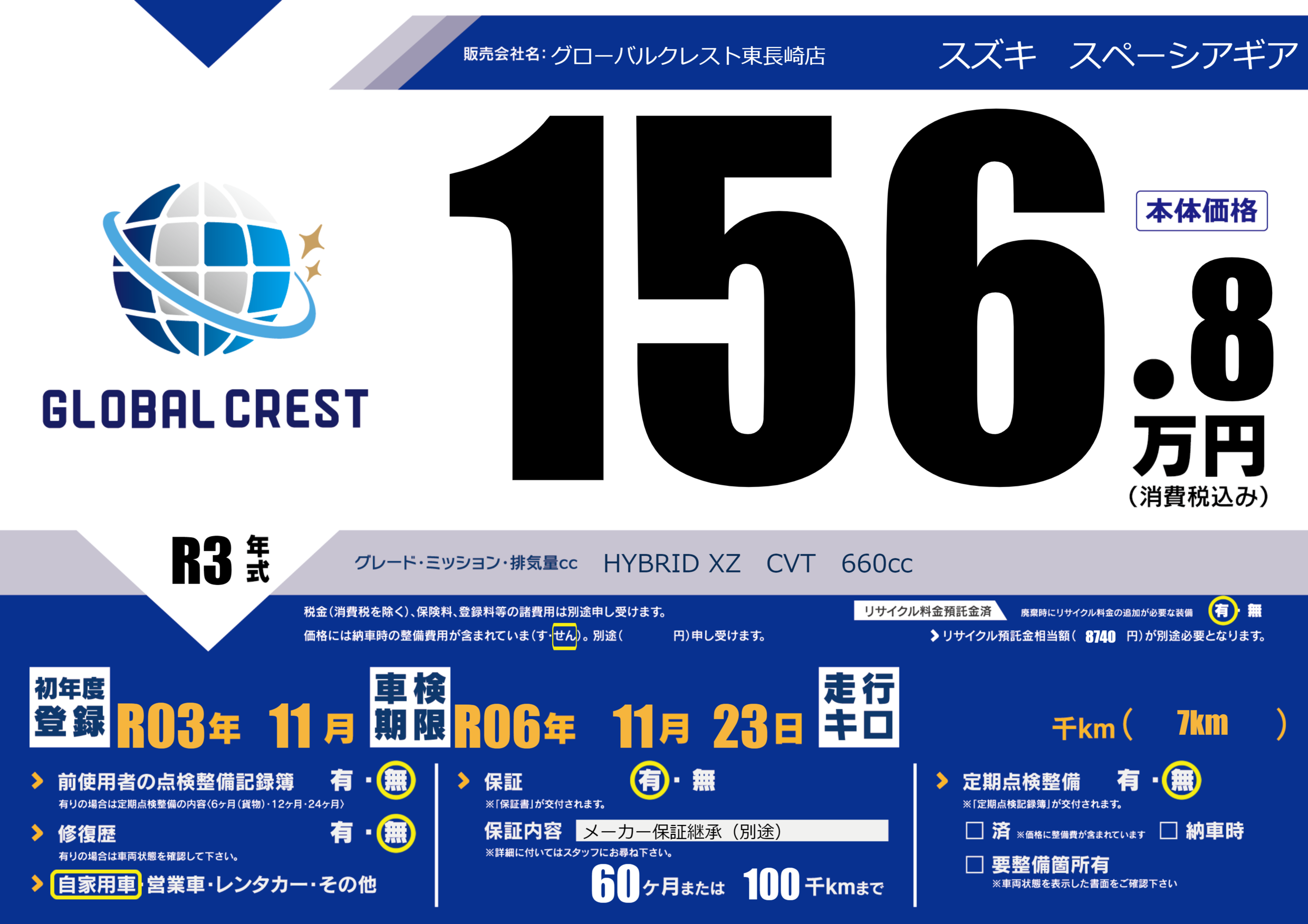 | 車名 | スズキ スペーシアギア | グレード ミッション 排気量 |