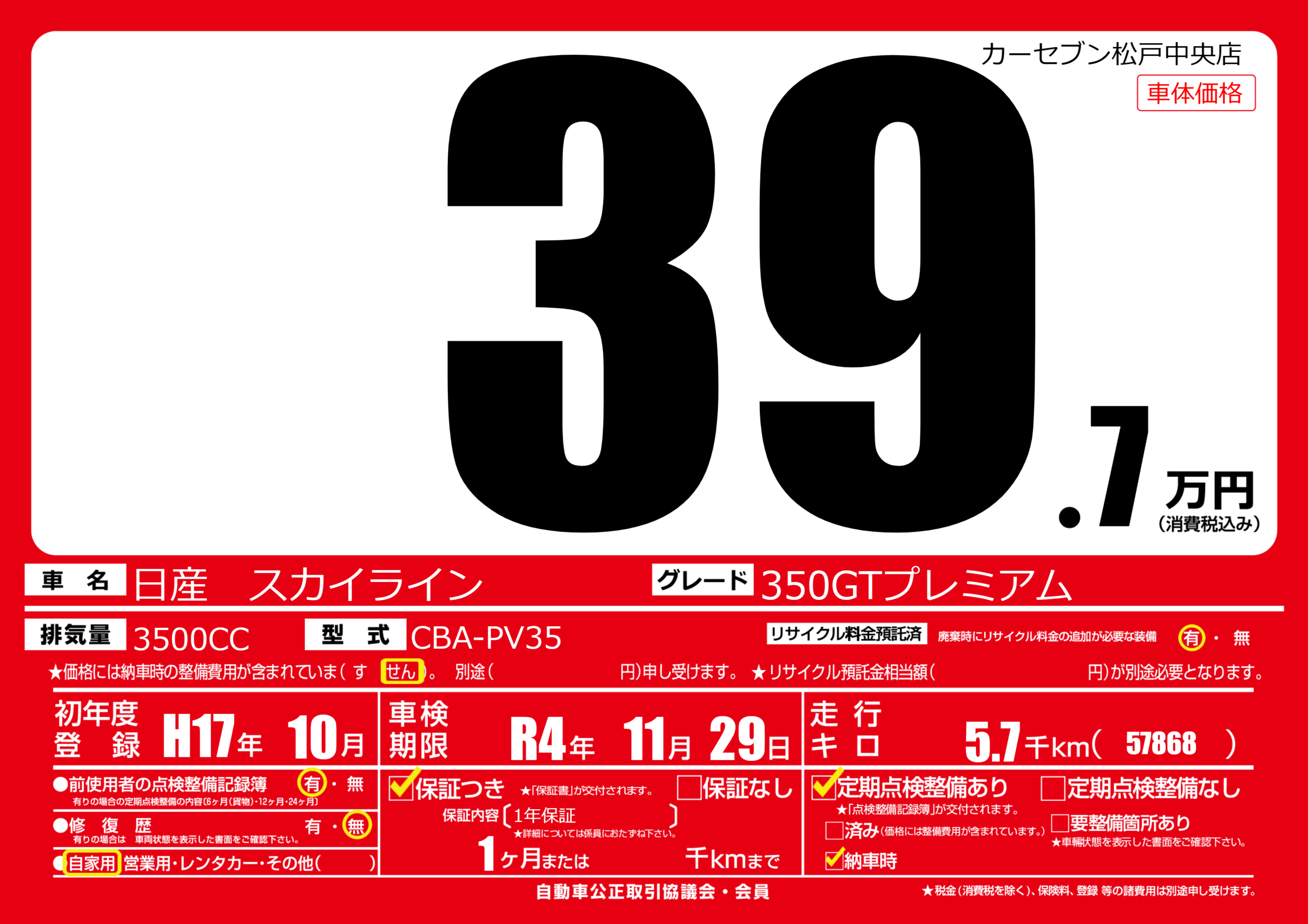 | 車名 | 日産 スカイライン | グレード ミッション 排気量 |