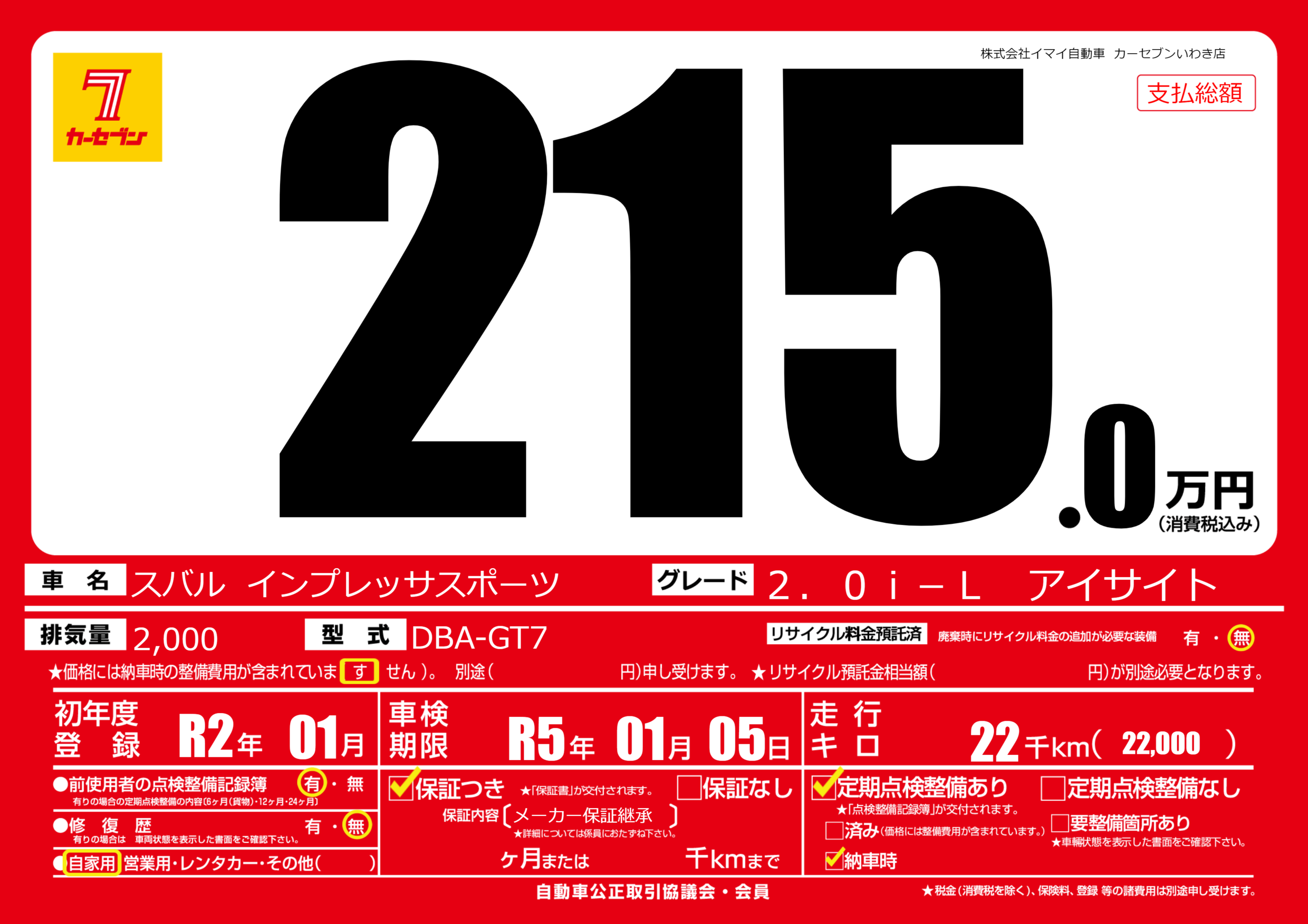 | 車検制限 | R5年 01月 05日 | ||