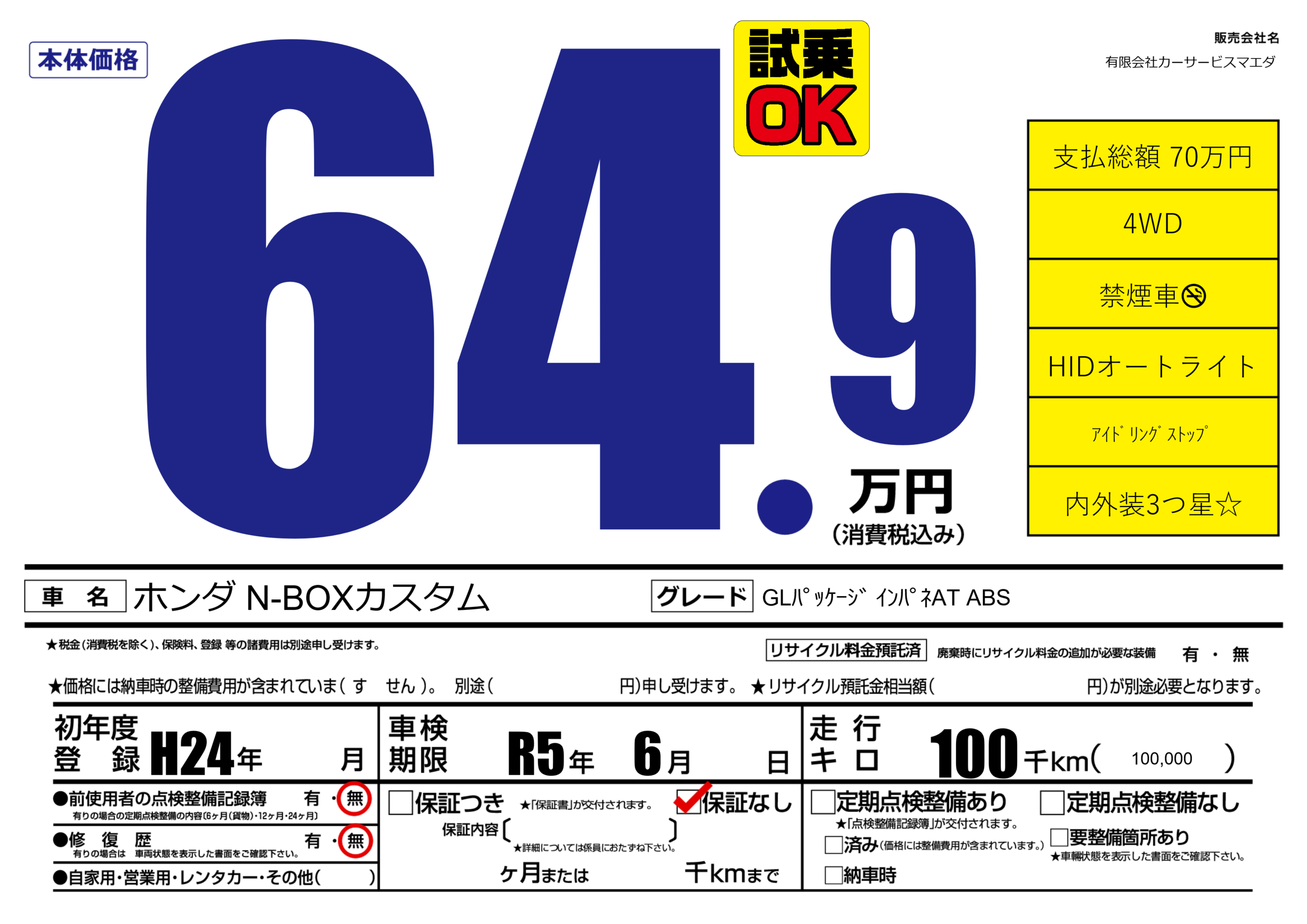 | 車名 | ホンダ N-BOXカスタム | グレード ミッション 排気量 |