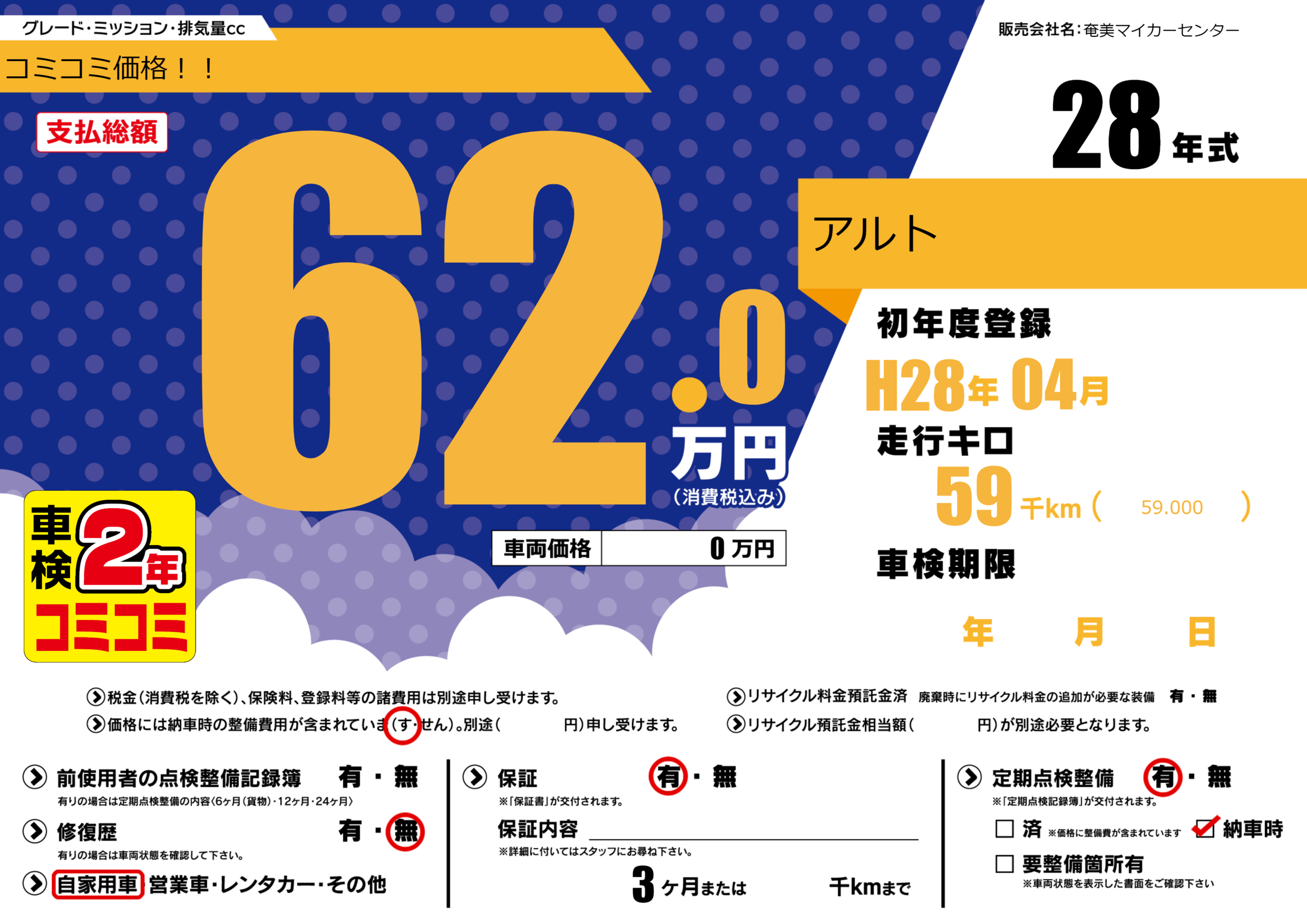 | 定期点検整備 | 定期点検整備あり 納車時あり | ||