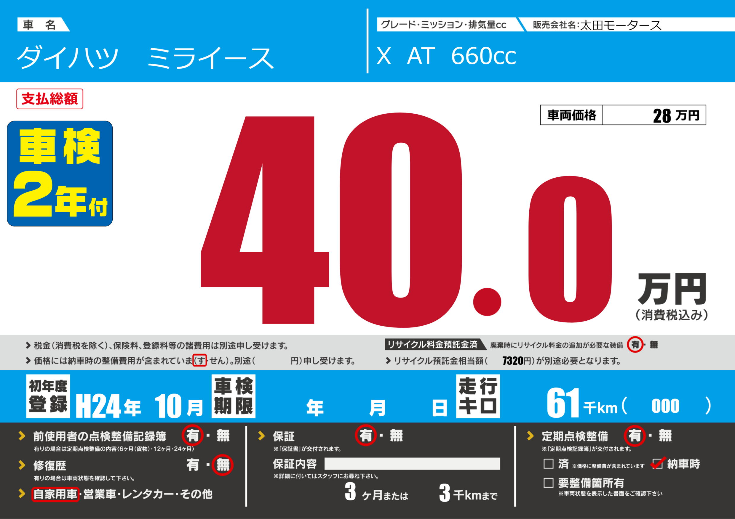 | 定期点検整備 | 定期点検整備あり 納車時あり | ||