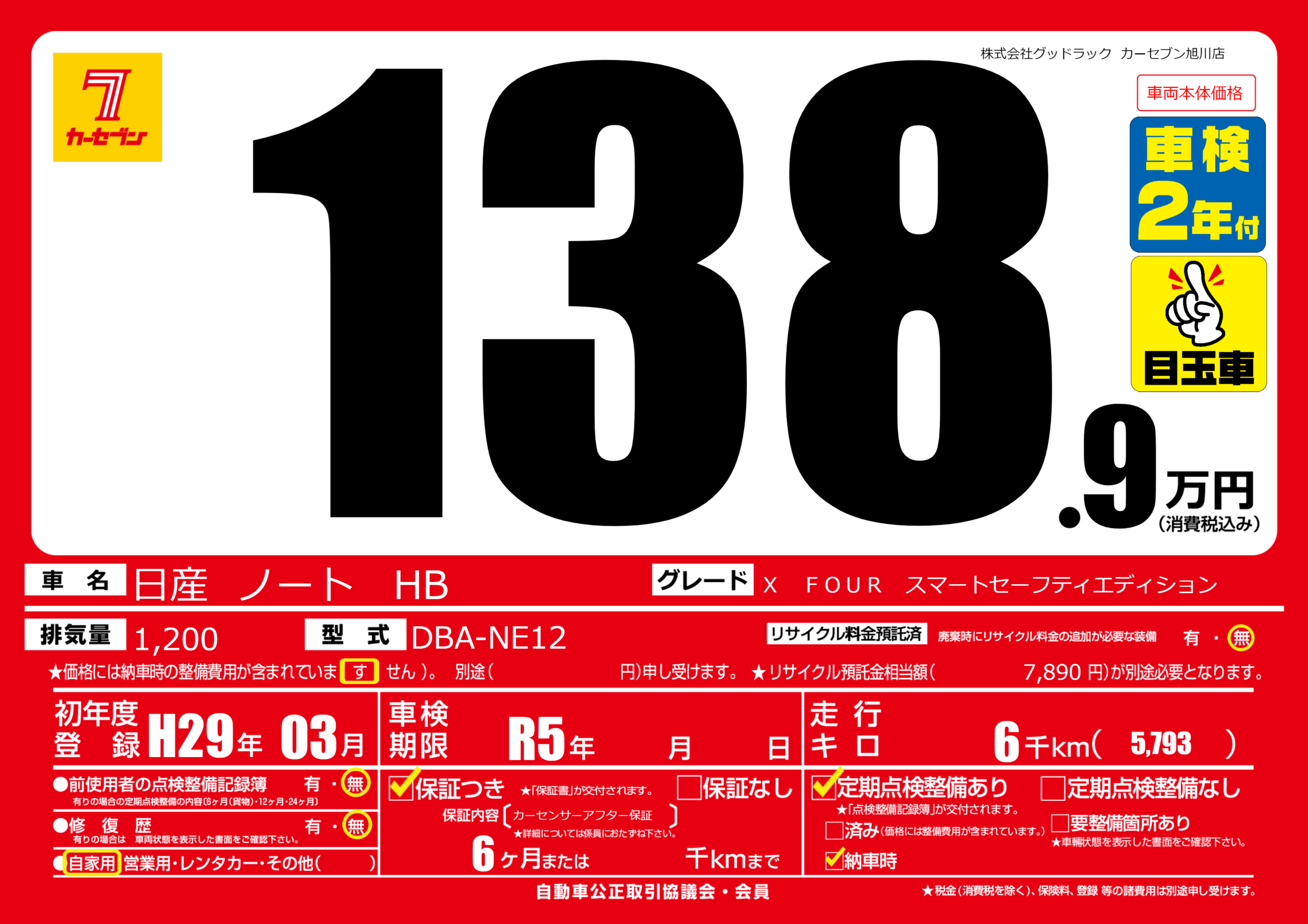 | 車名 | 日産 ノート HB | グレード ミッション 排気量 |