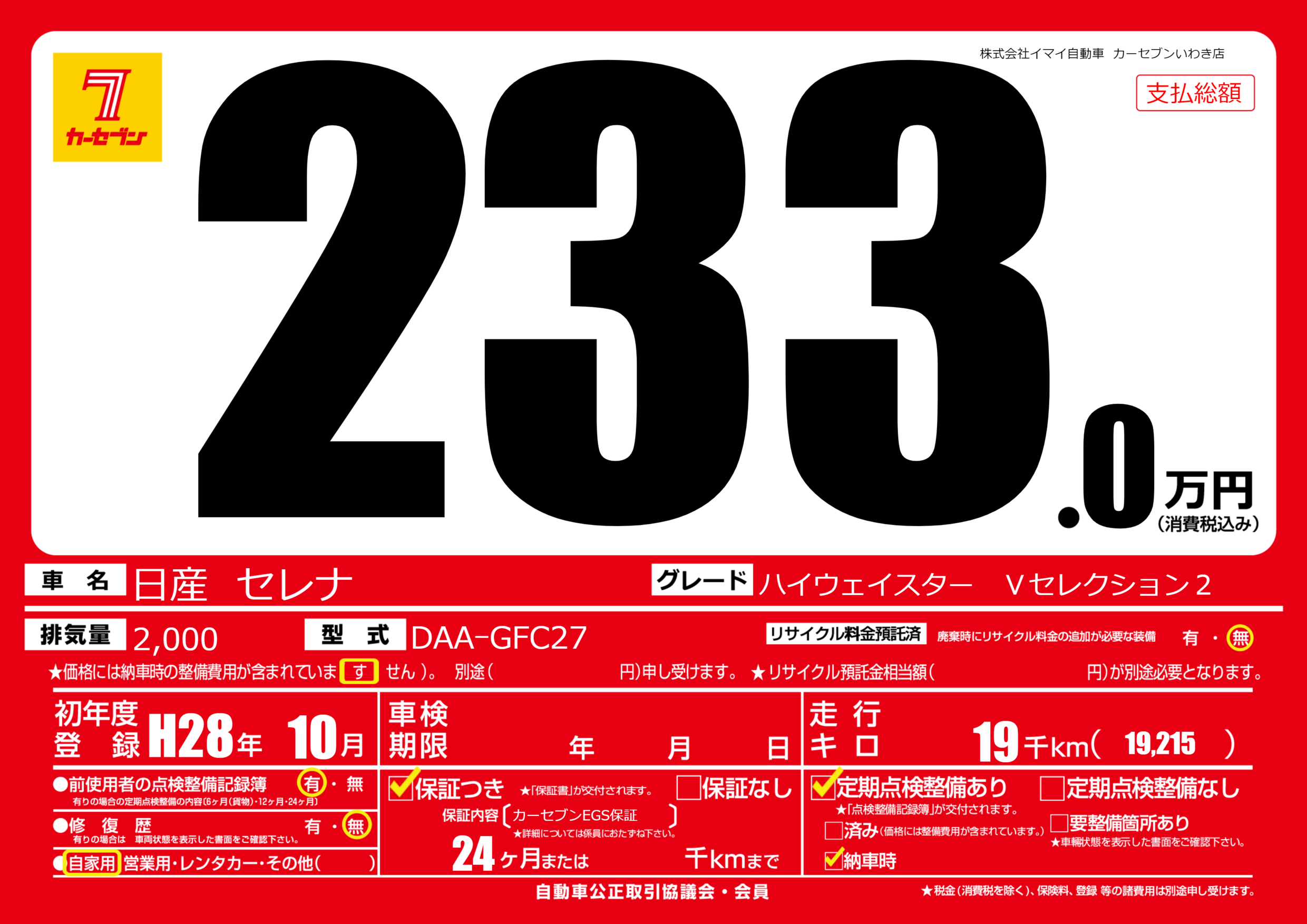 | 車名 | 日産 セレナ | グレード ミッション 排気量 |
