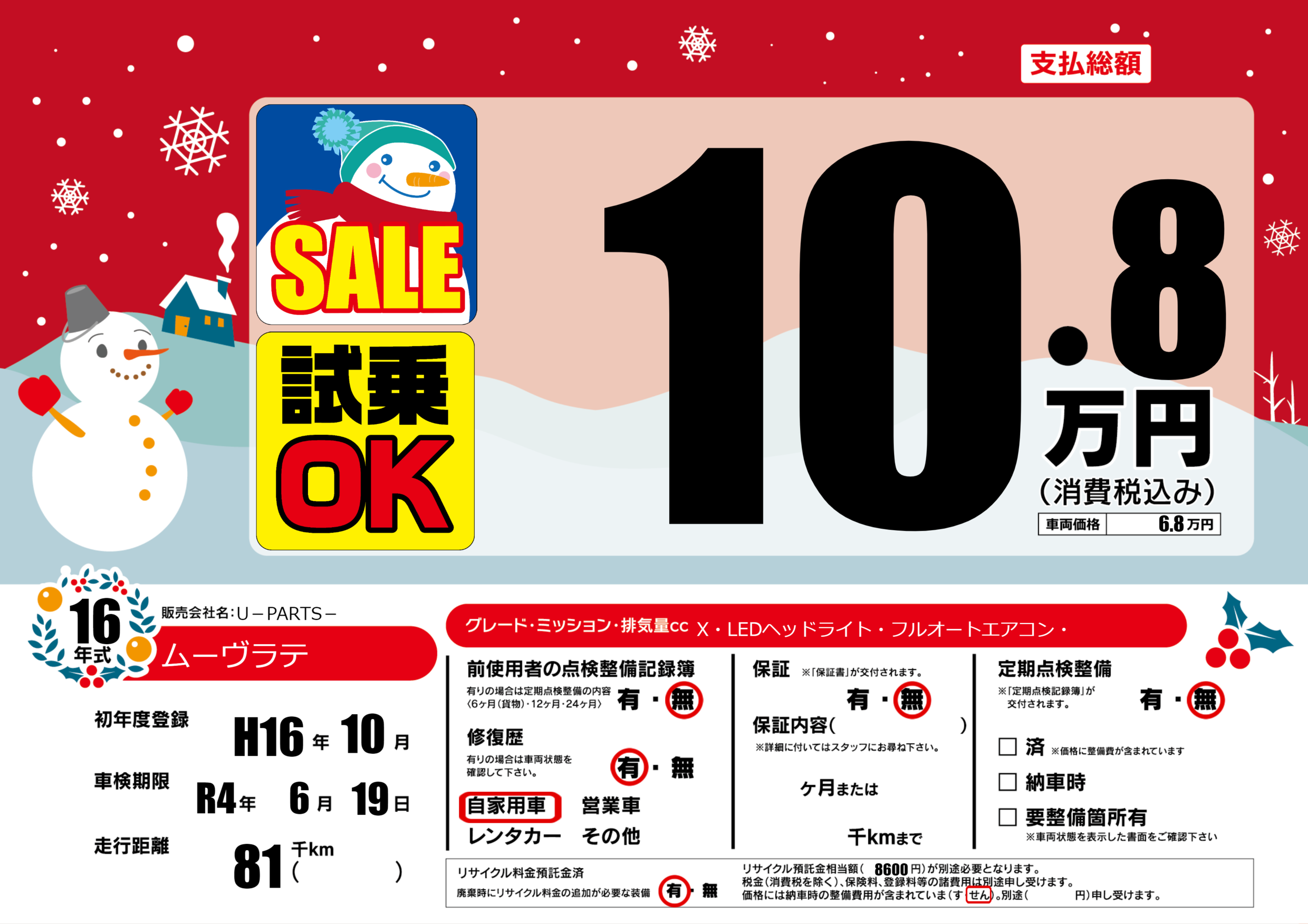 | 走行キロ | 8.1万km | 初年度登録 | H16年10月 |