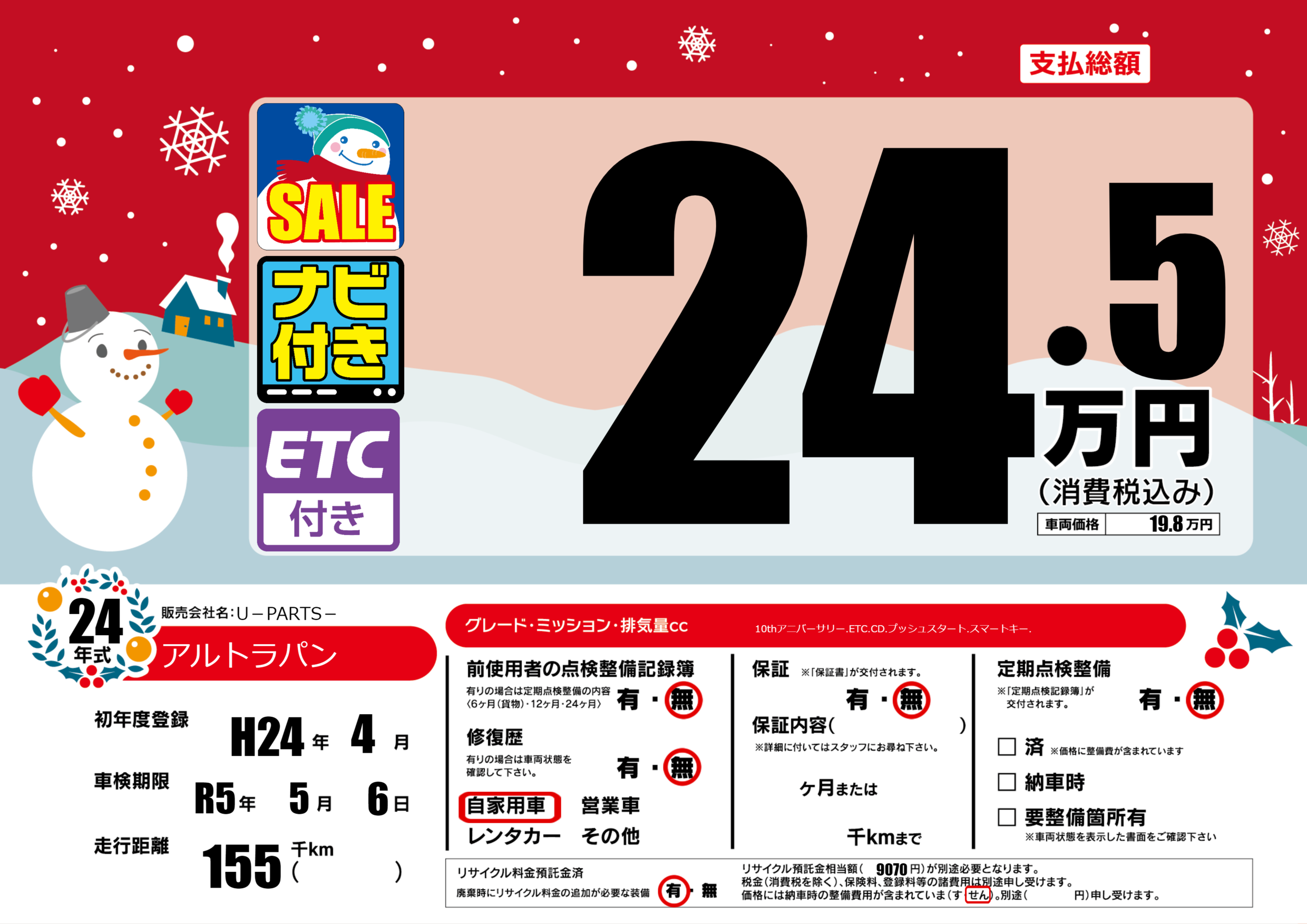 | 走行キロ | 15.5万km | 初年度登録 | H24年4月 |