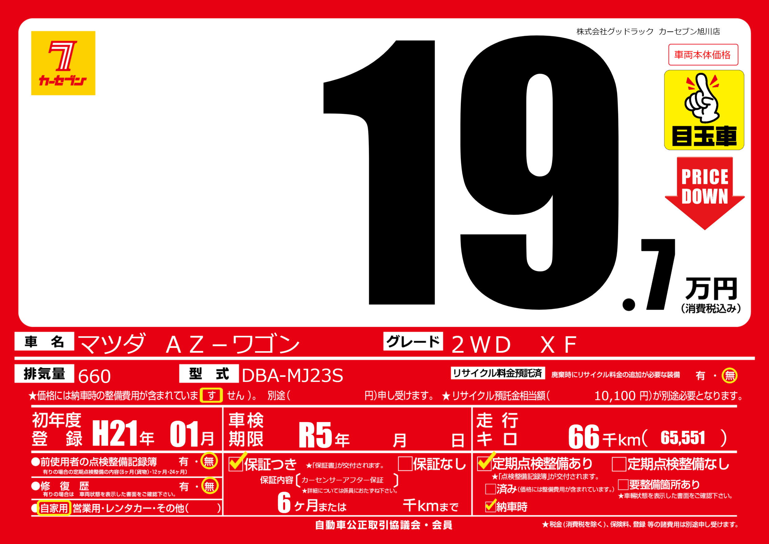 | 車名 | マツダ AZ-ワゴン | グレード ミッション 排気量 |