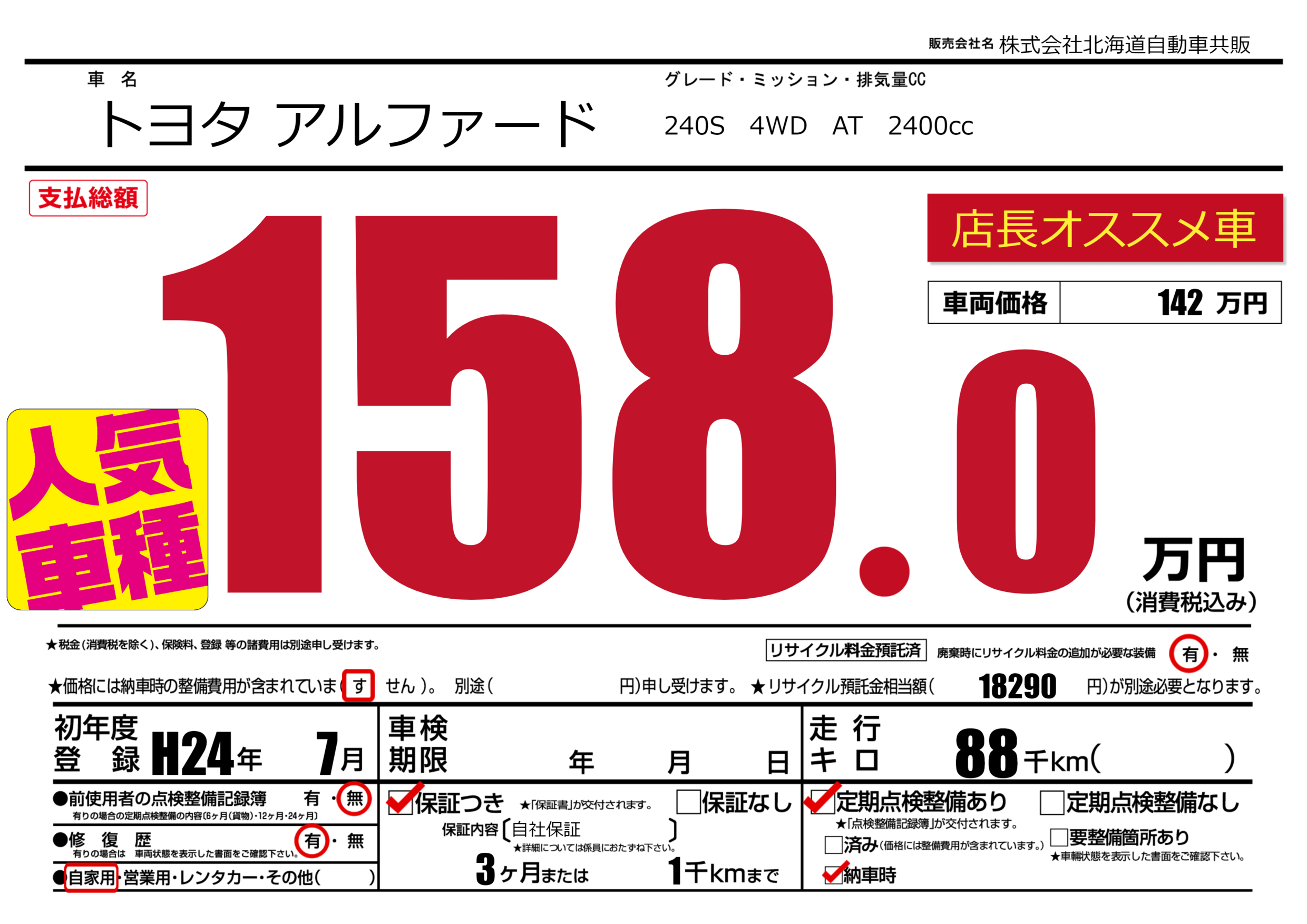 | 車名 | トヨタ アルファード | グレード ミッション 排気量 |