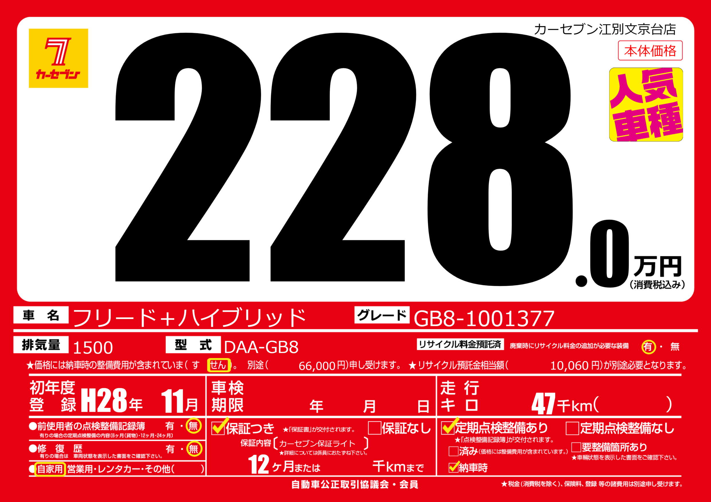 保証付き 保証内容(カーセブン保証ライト) 12ヶ月または()千kmまで |
