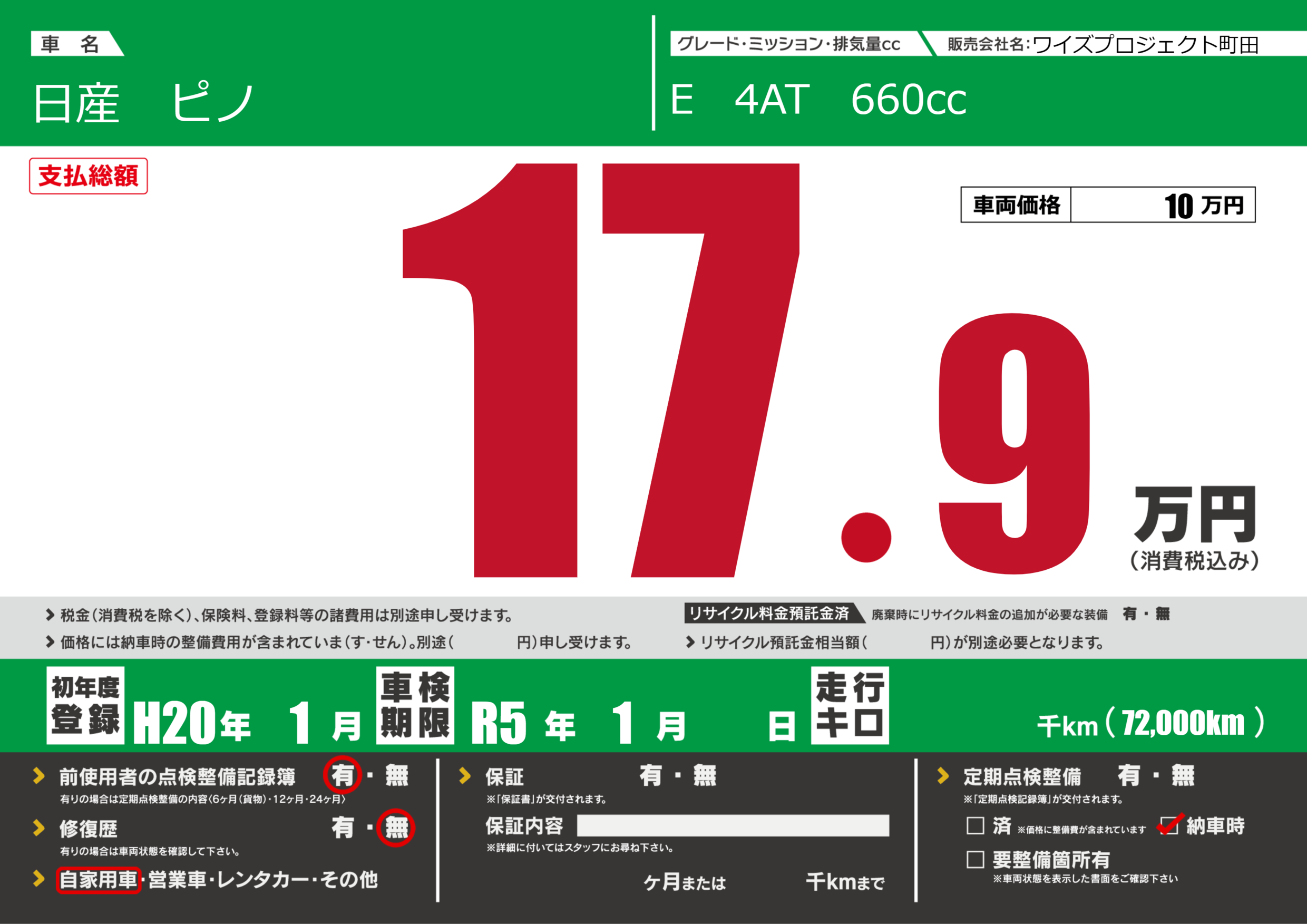 | 車名 | 日産 ピノ | グレード ミッション 排気量 |