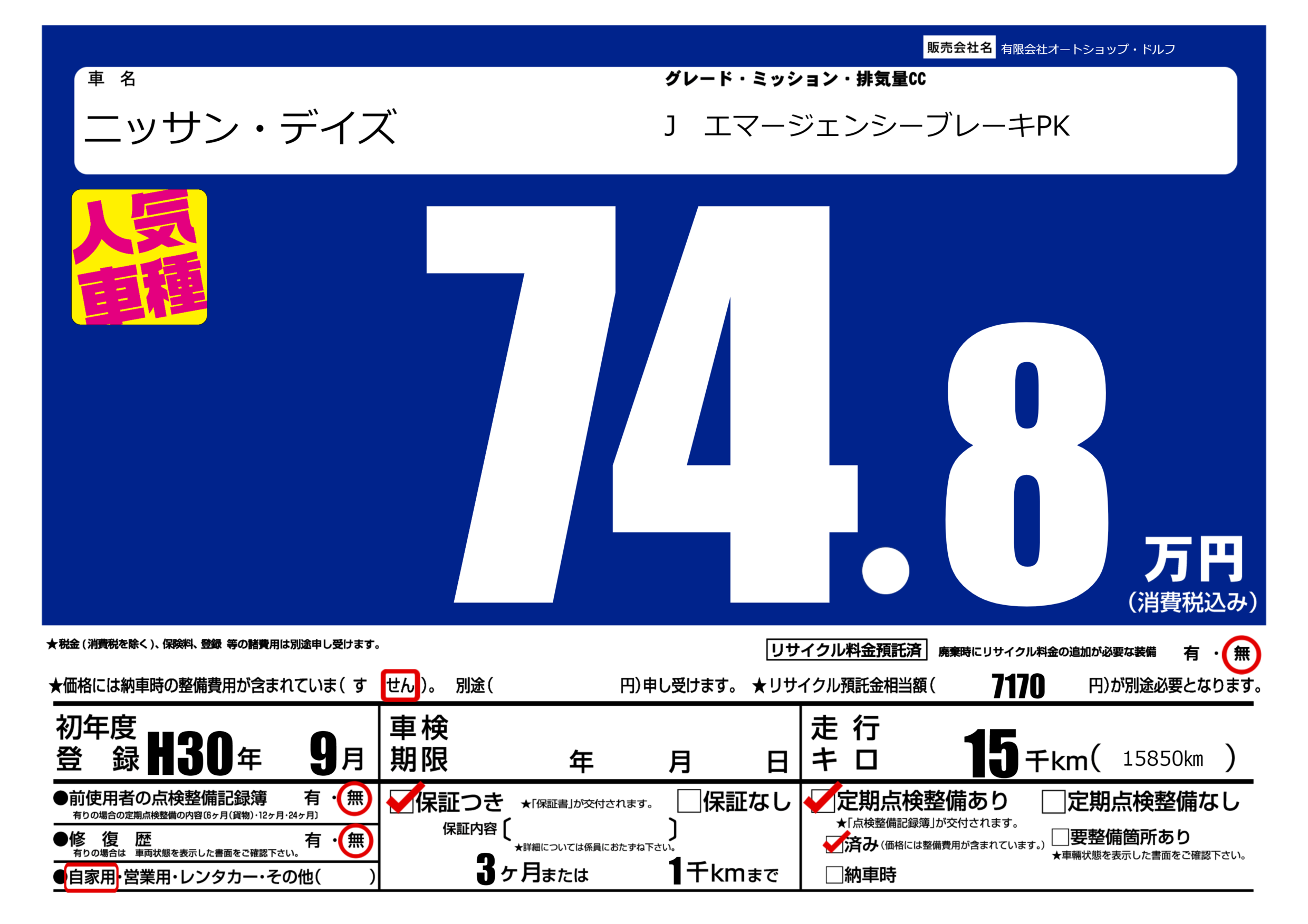 | 定期点検整備 | 定期点検整備あり 定期点検整備済み | ||