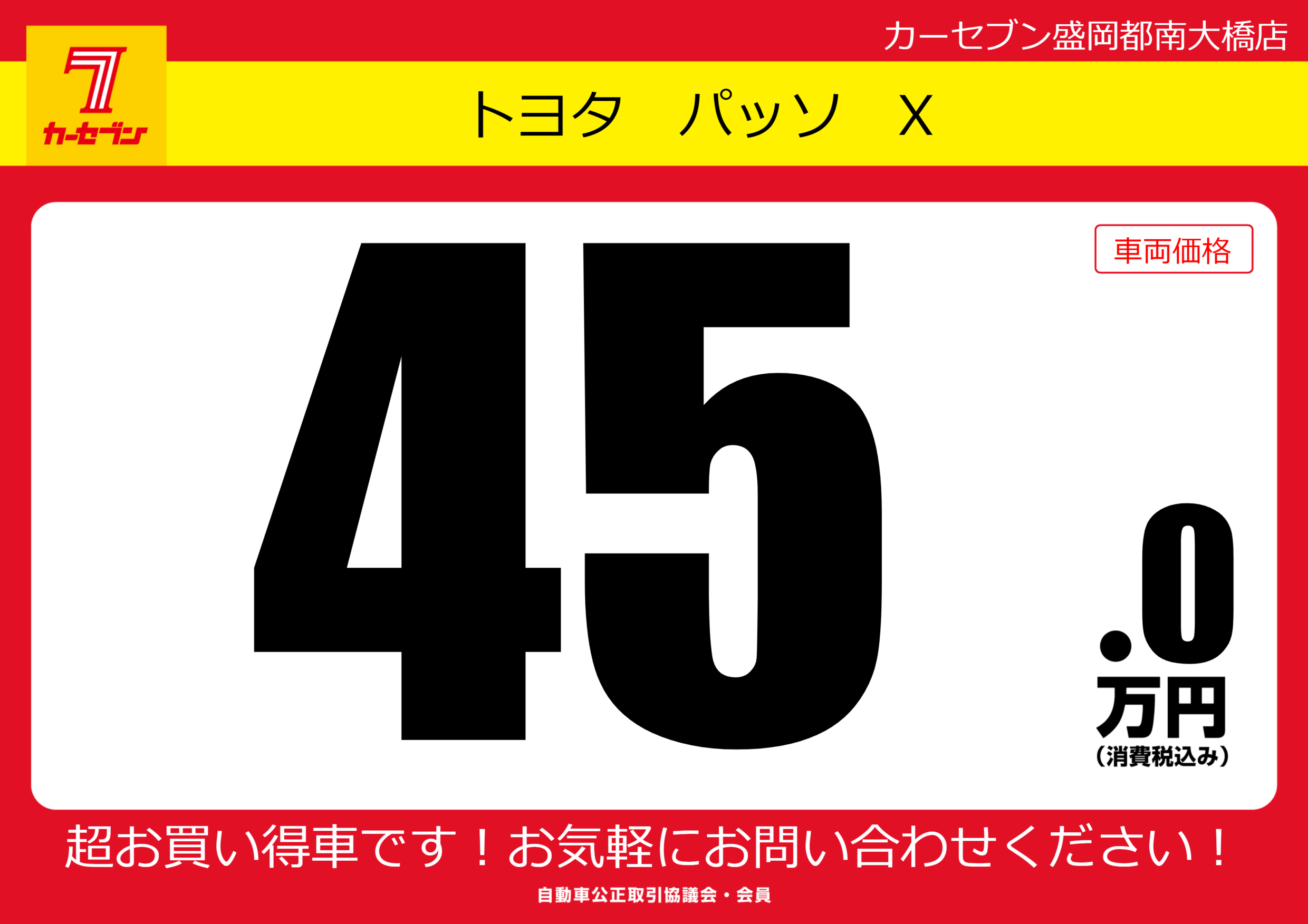 | 車名 | トヨタ パッソ X | グレード ミッション 排気量 |