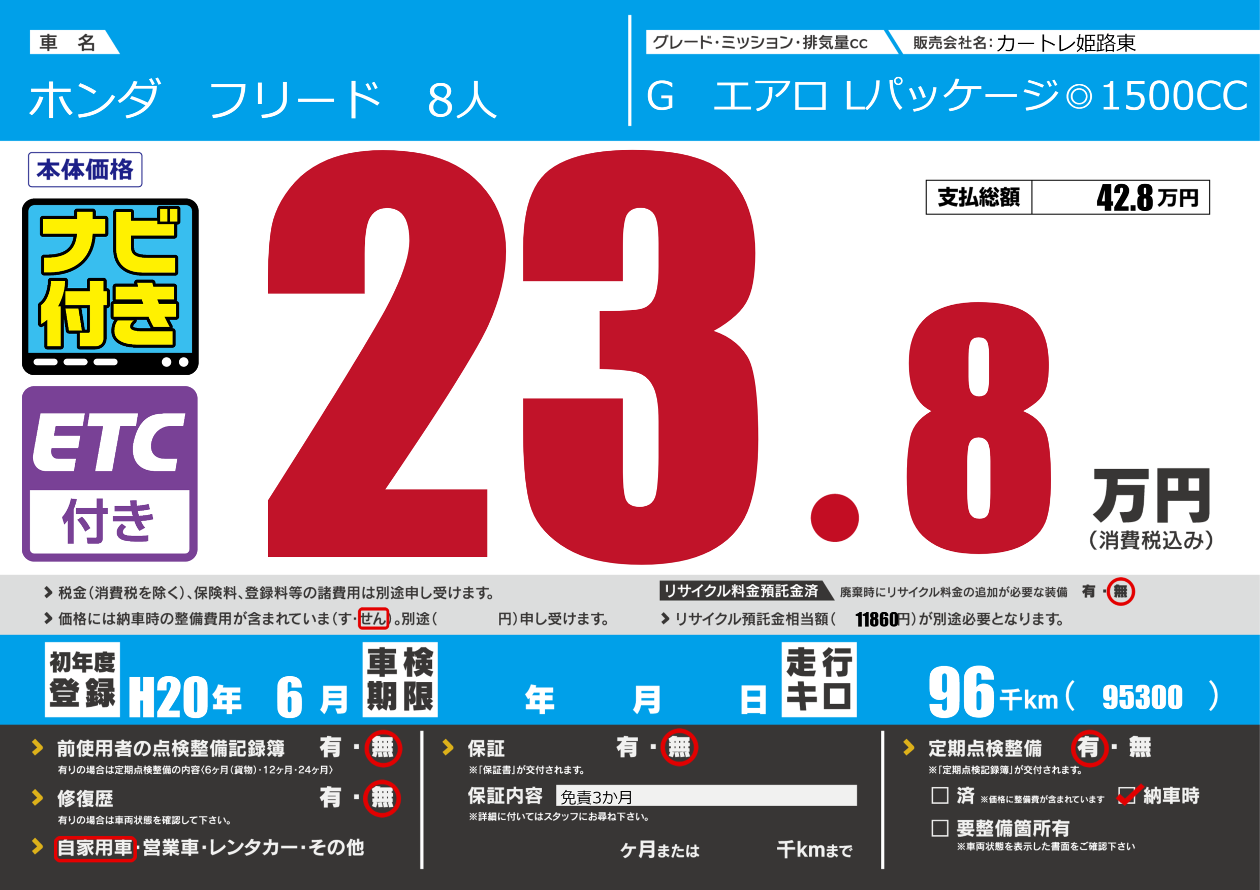 | 車名 | ホンダ フリード 8人 | グレード ミッション 排気量 |