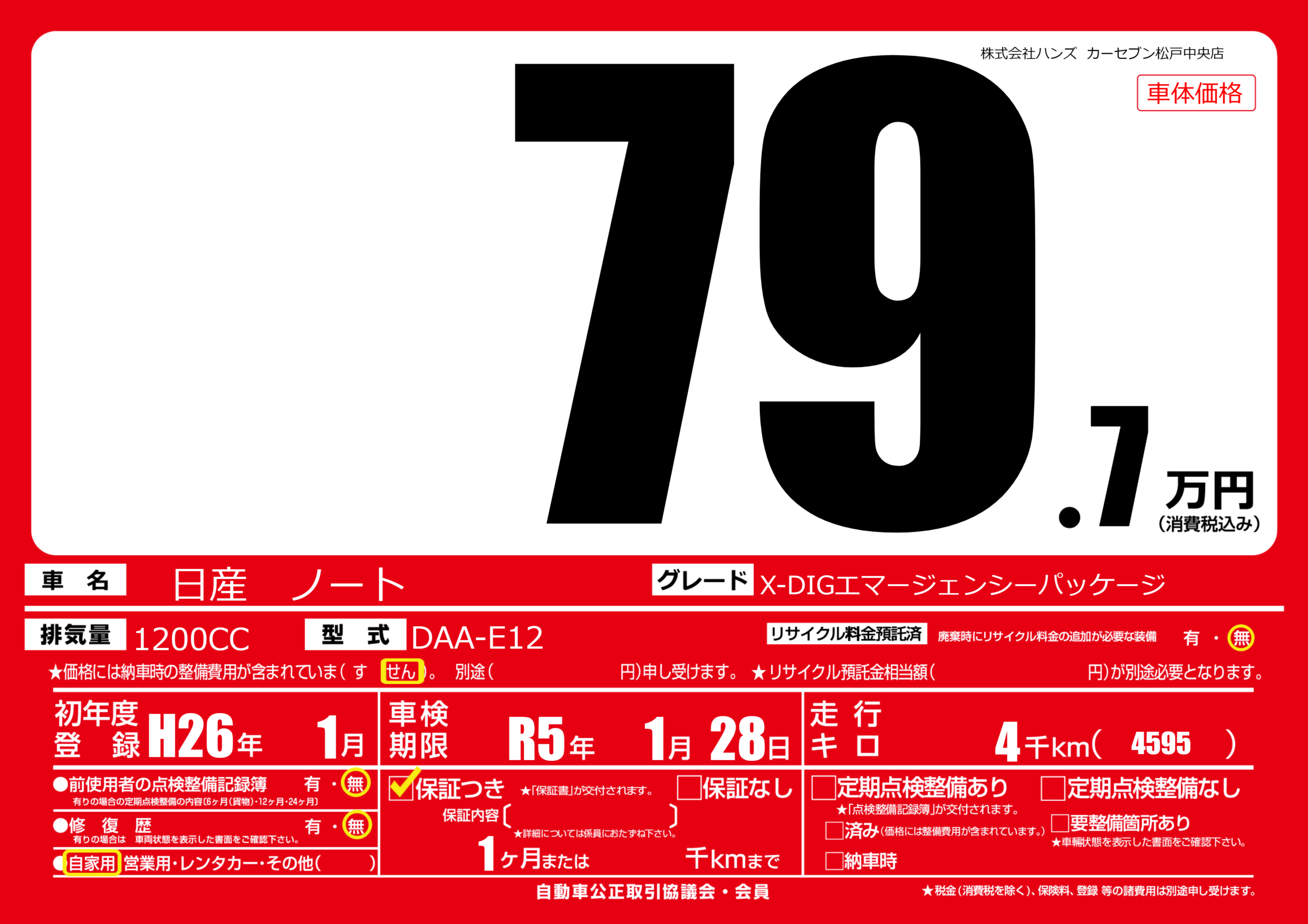 | 車名 | 日産 ノート | グレード ミッション 排気量 |
