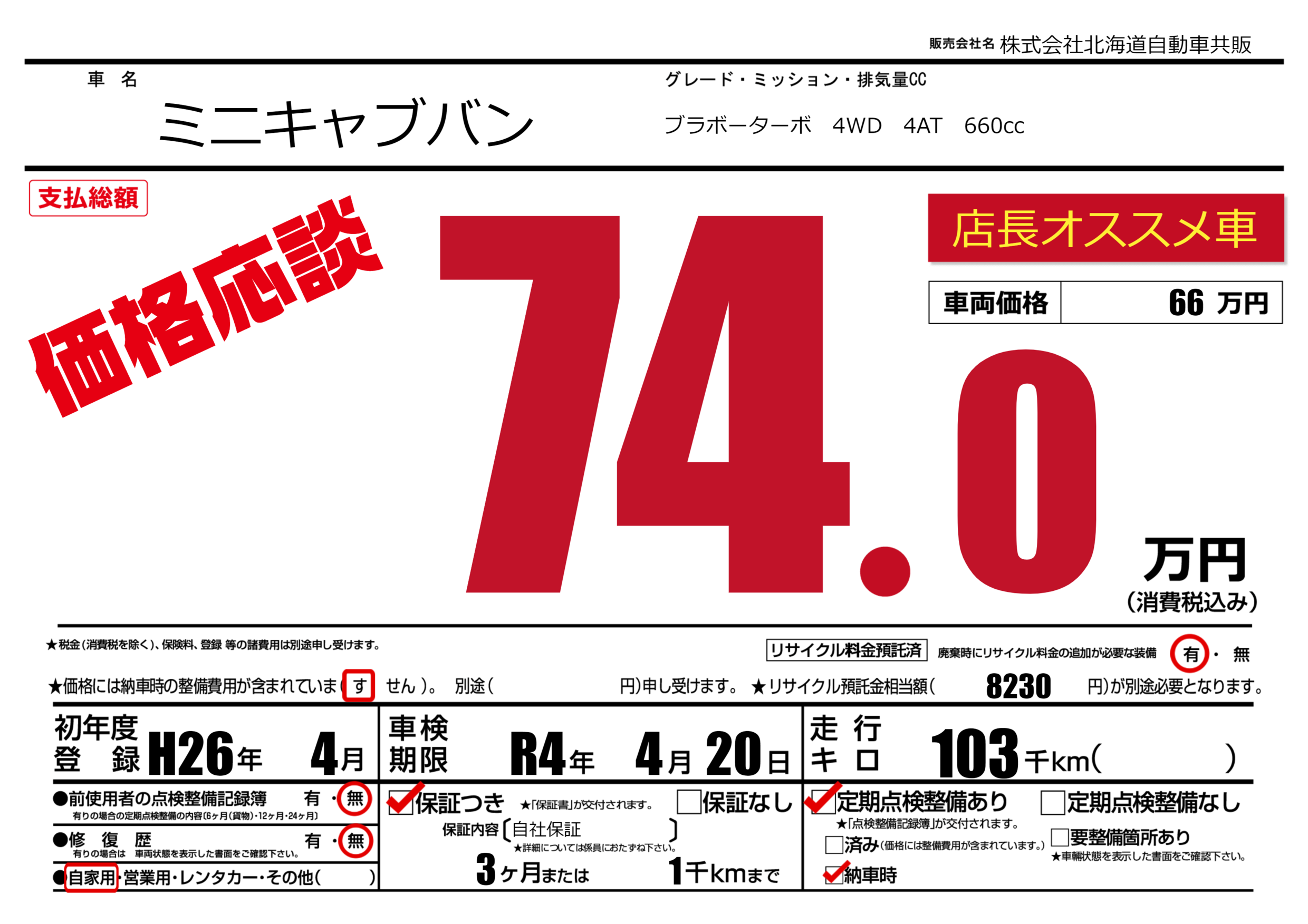 | 走行キロ | 10.3万km | 初年度登録 | H26年4月 |