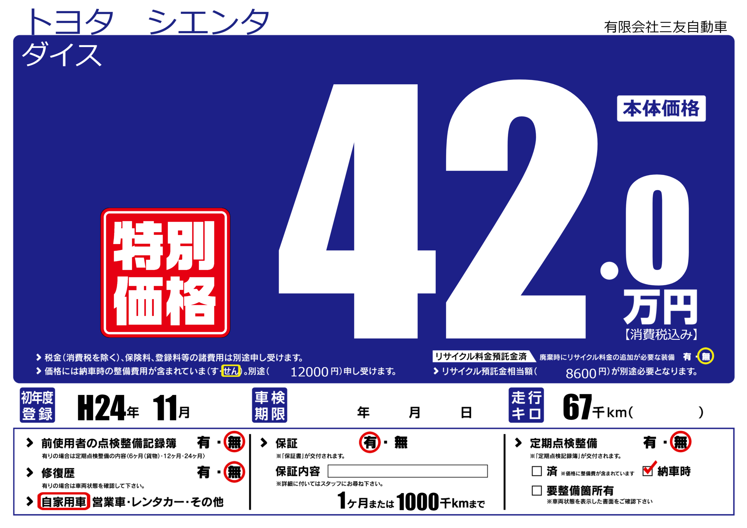 保証付き 保証内容(---) 1ヶ月または(1000)千kmまで |