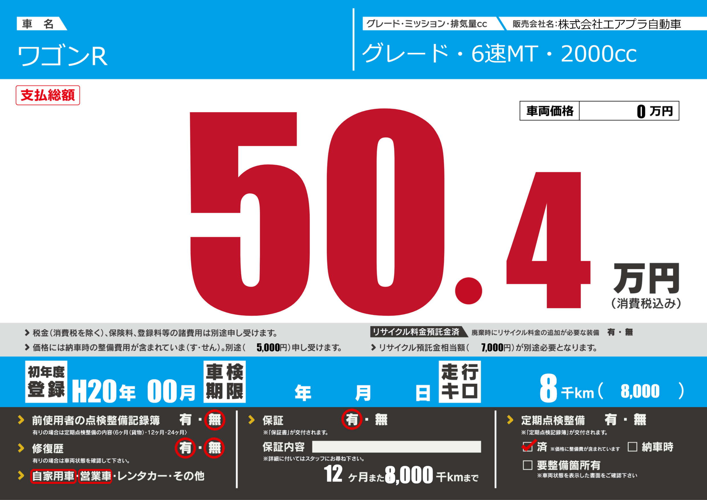 保証付き 保証内容(---) 12ヶ月または(8,000)千kmまで |