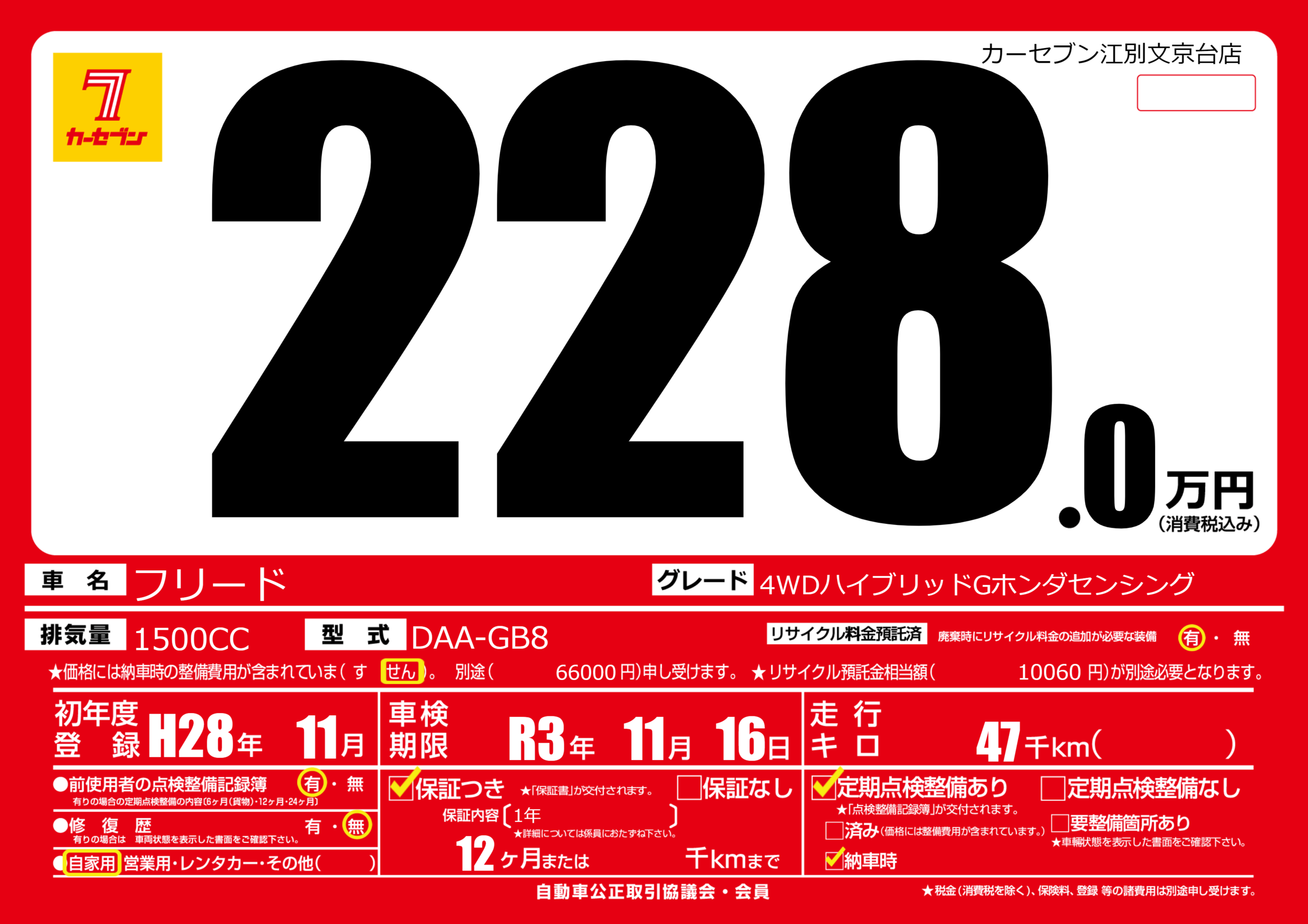| 走行キロ | 4.7万km | 初年度登録 | H28年11月 |