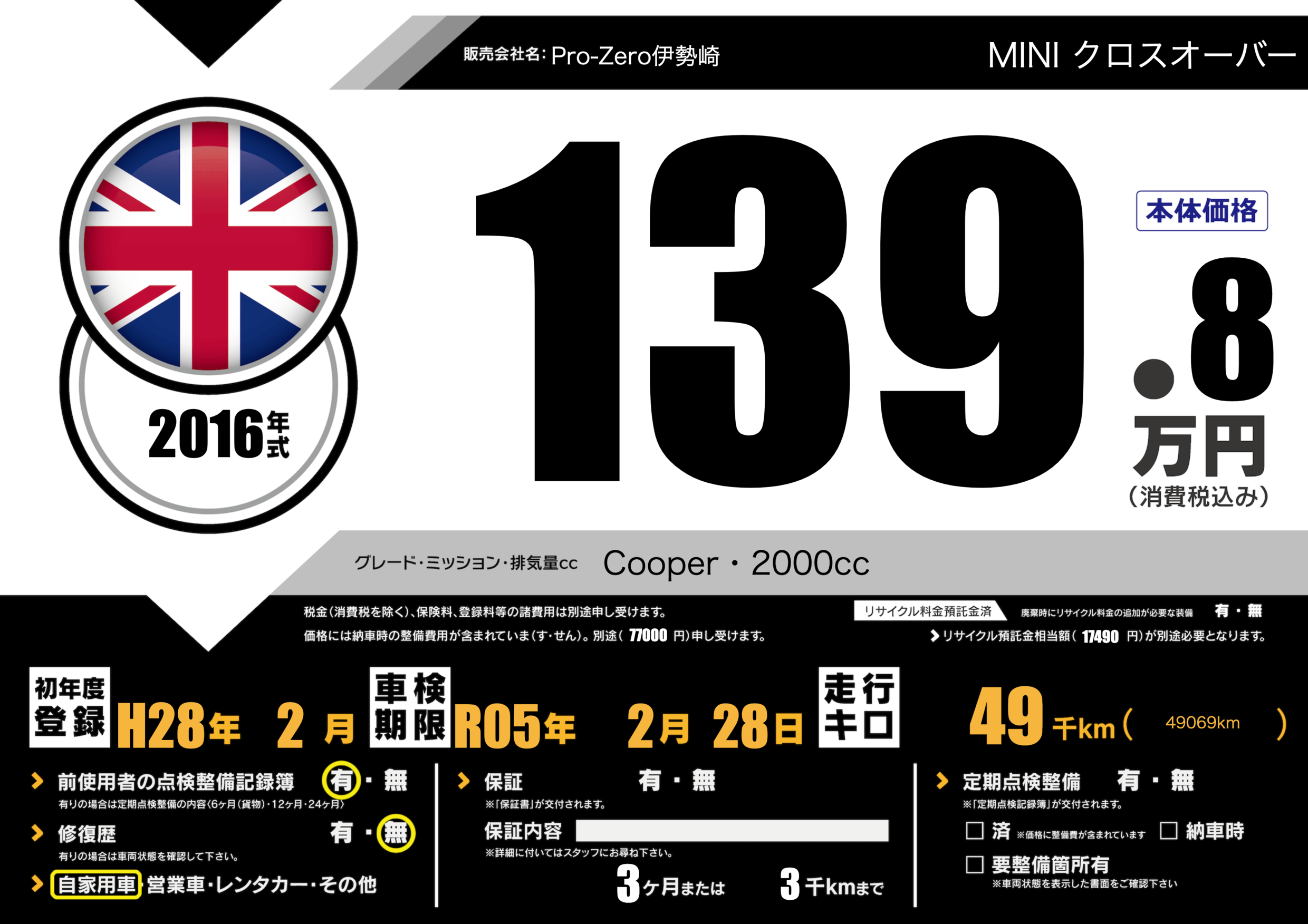 | 車名 | MINI クロスオーバー | グレード ミッション 排気量 |