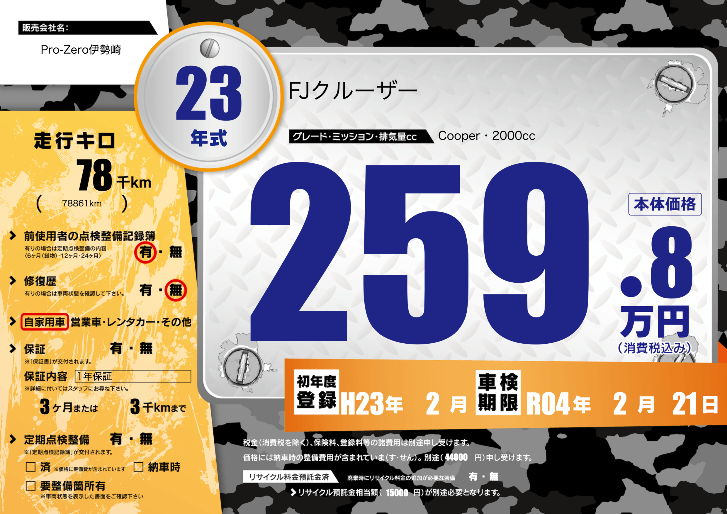 | 走行キロ | 7.8万km | 初年度登録 | H23年2月 |