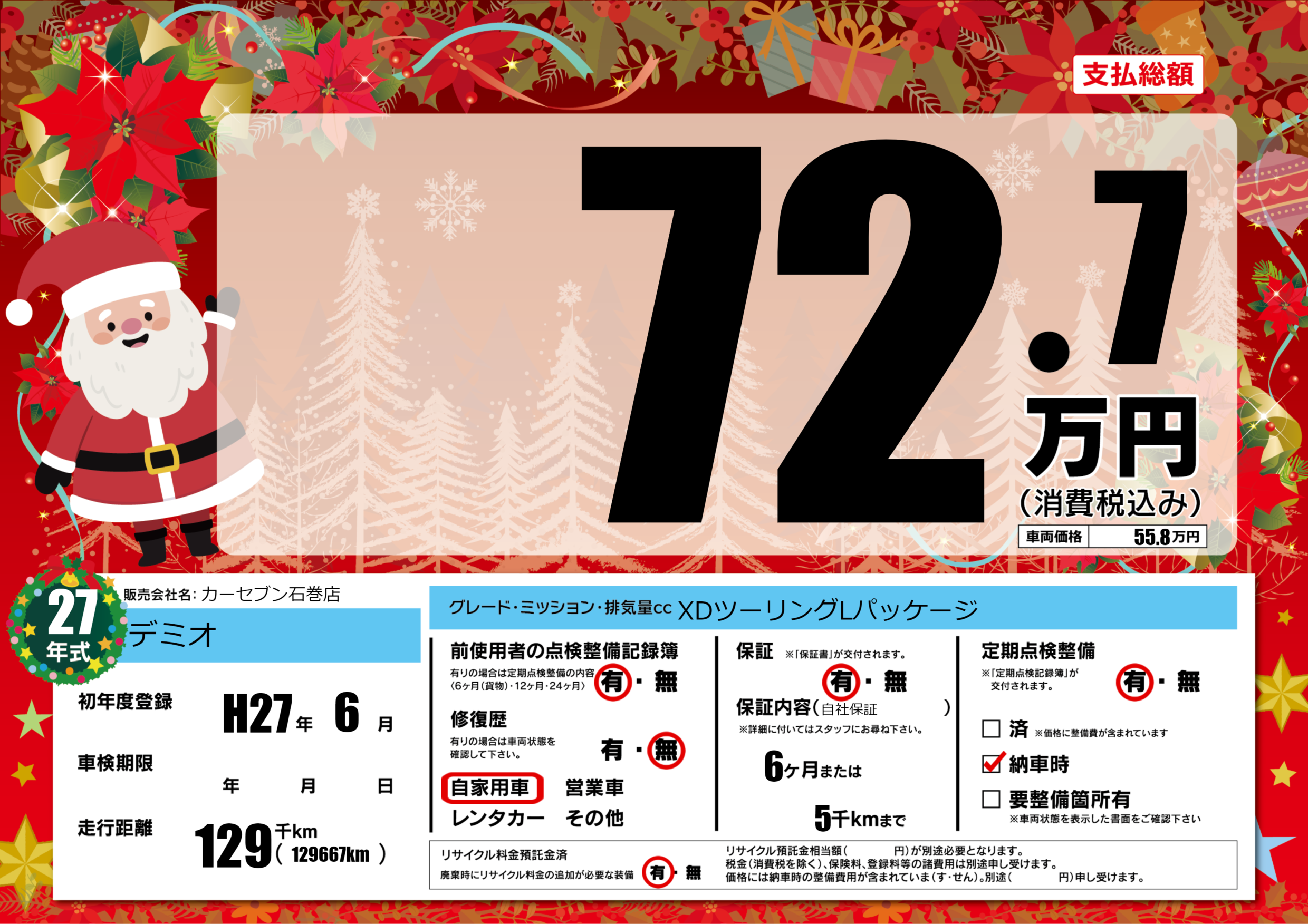 | 走行キロ | 12.9万km | 初年度登録 | H27年6月 |