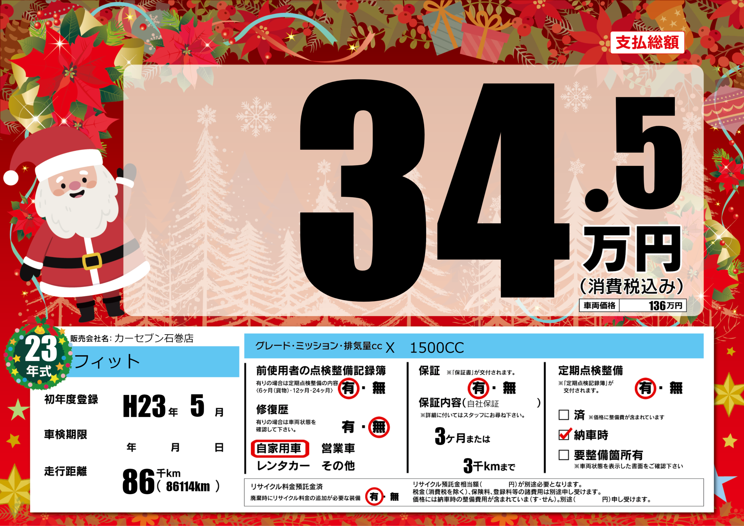 | 走行キロ | 8.6万km | 初年度登録 | H23年5月 |