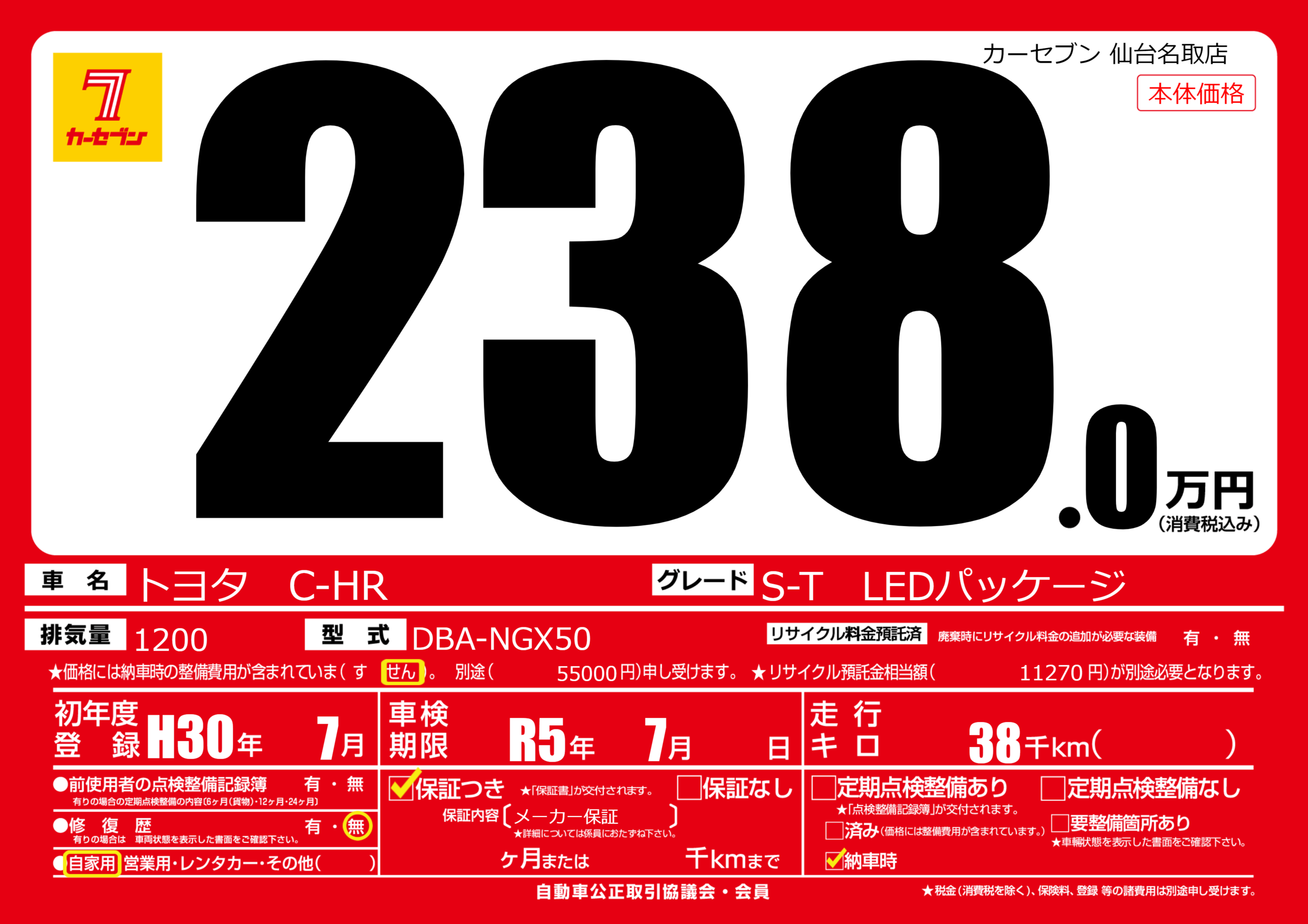 | 走行キロ | 3.8万km | 初年度登録 | H30年7月 |