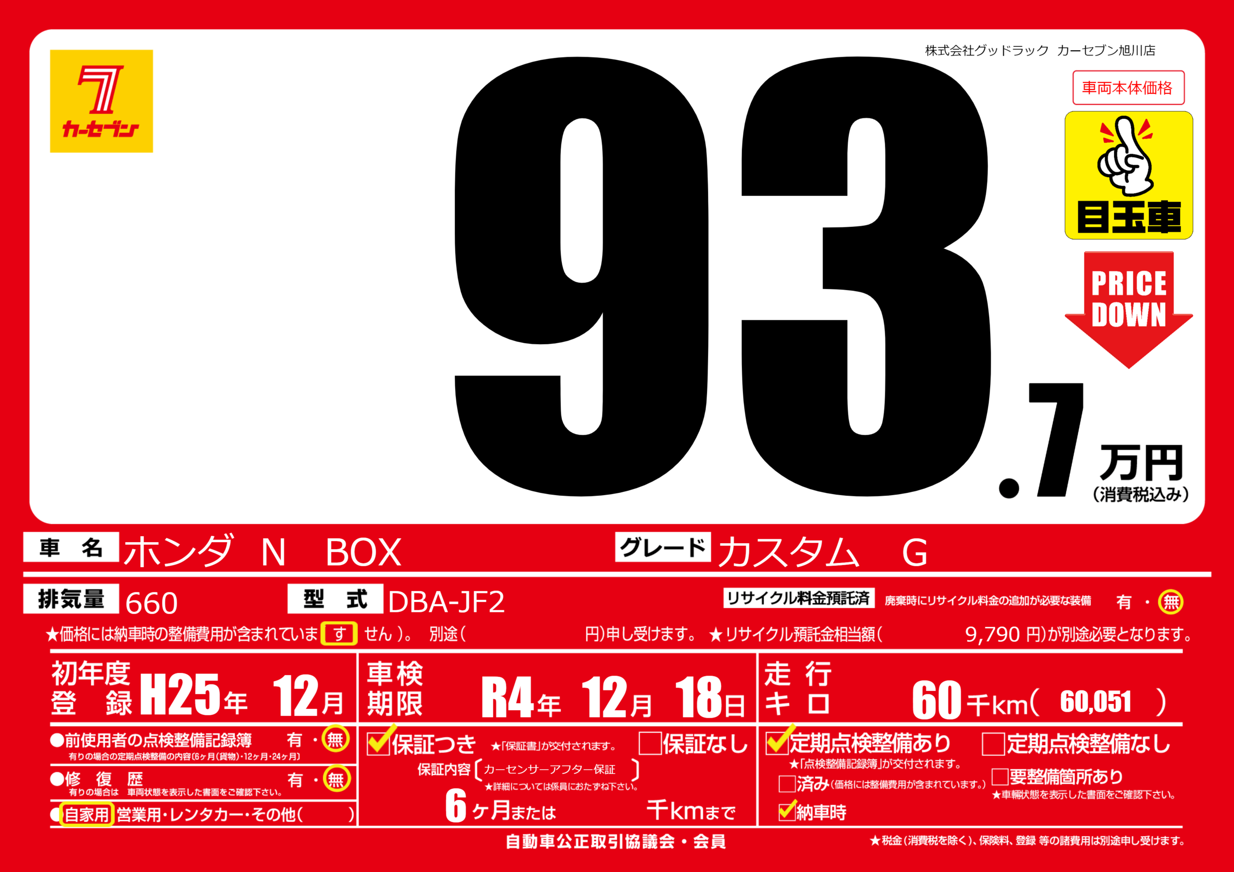| 車名 | ホンダ N BOX | グレード ミッション 排気量 |