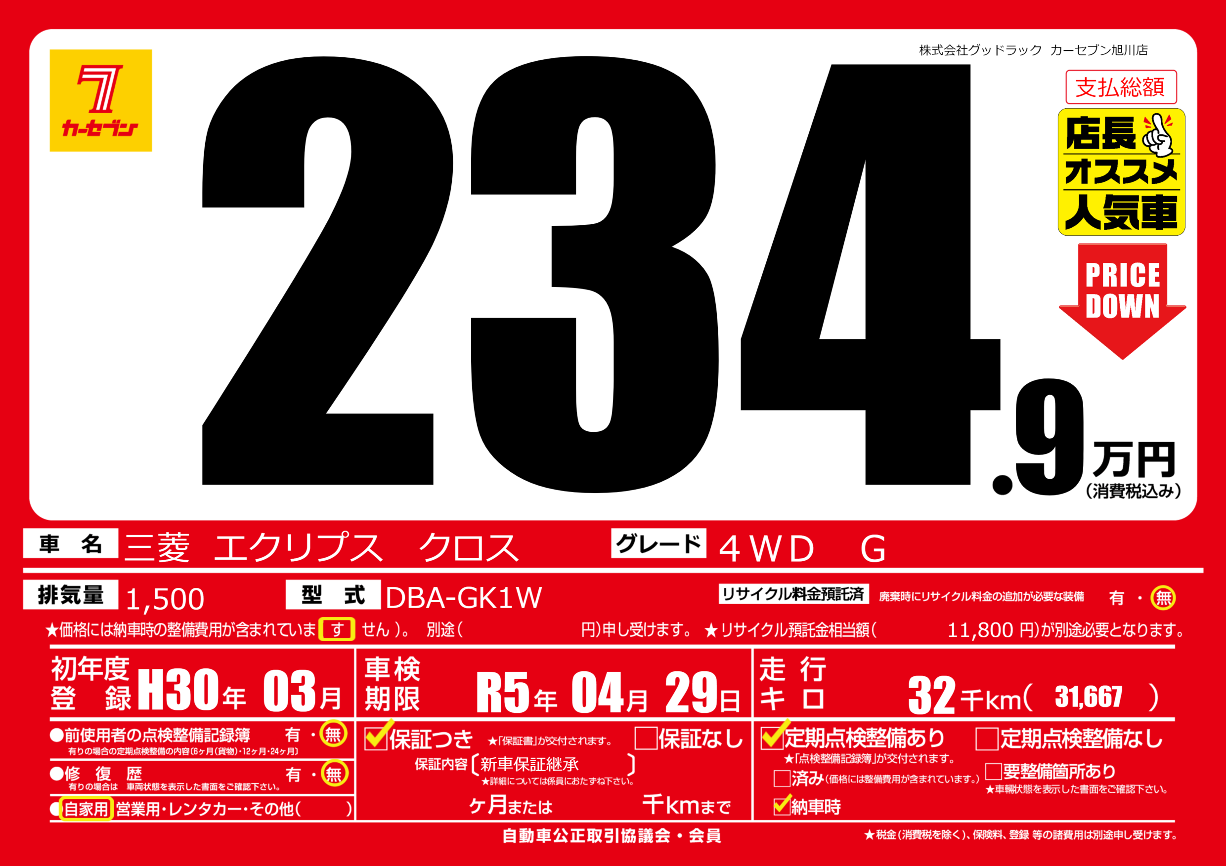 | 車名 | 三菱 エクリプス クロス | グレード ミッション 排気量 |