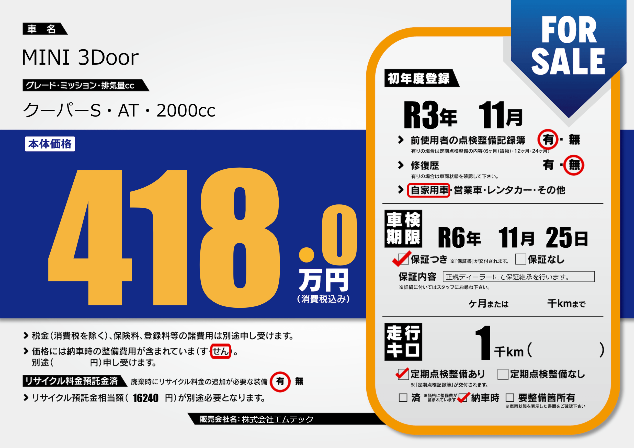 | 車名 | MINI 3Door | グレード ミッション 排気量 |