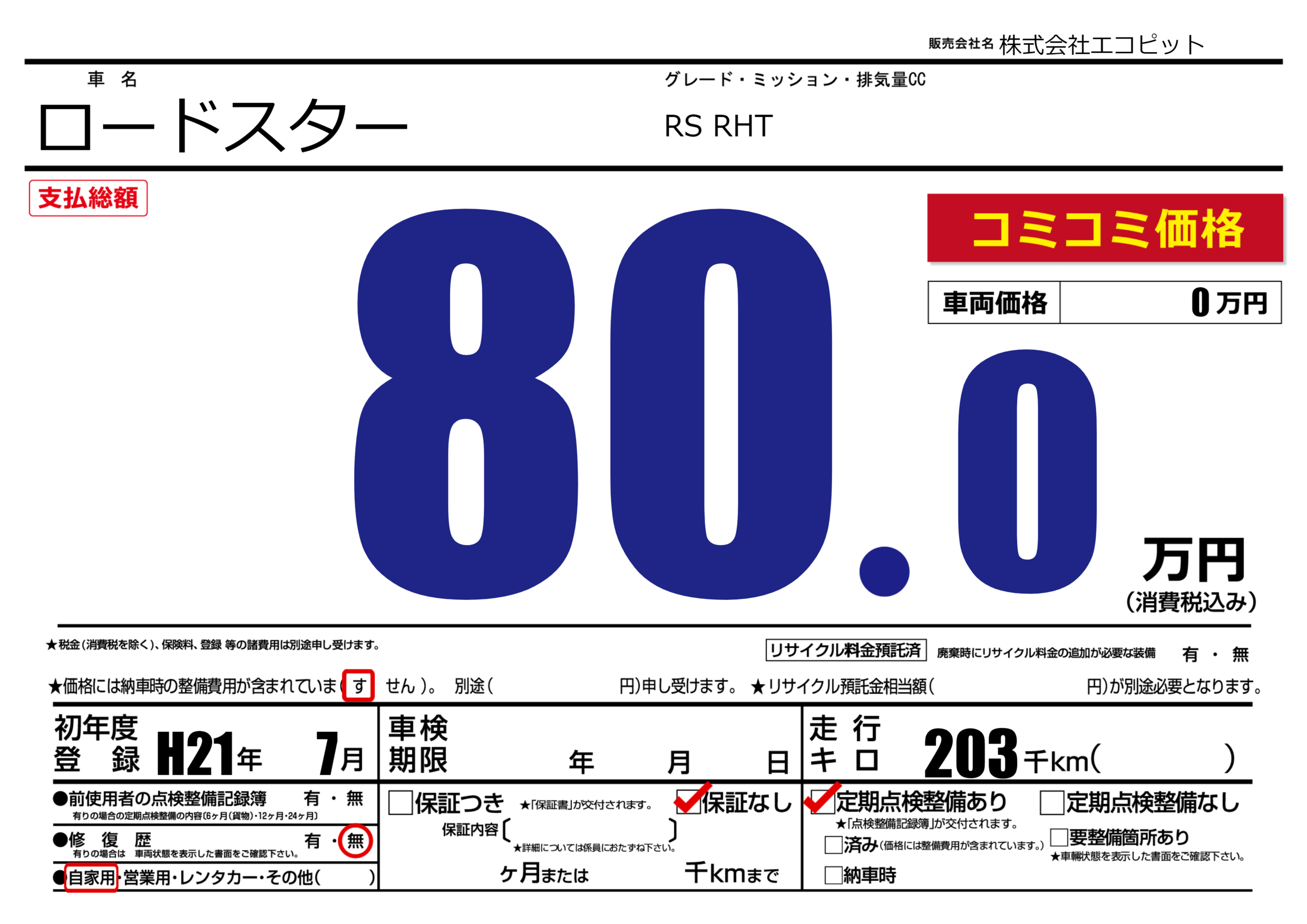 | 車名 | ロードスター | グレード ミッション 排気量 |