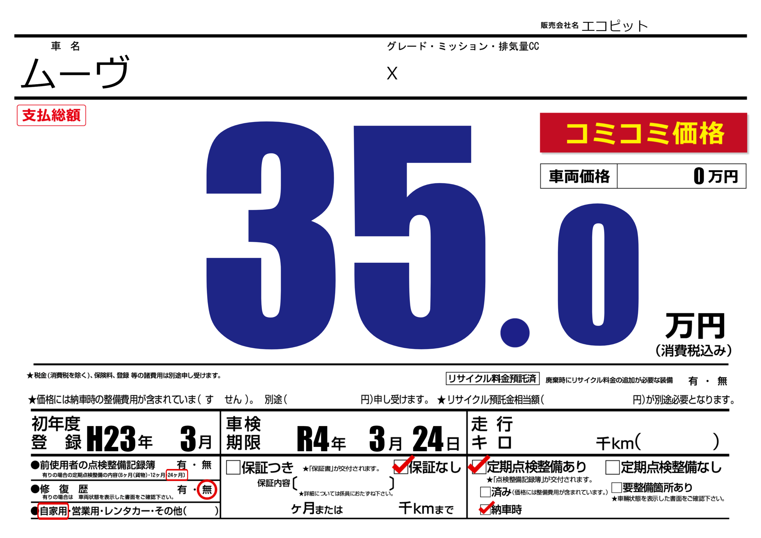 | 車名 | ムーヴ | グレード ミッション 排気量 |