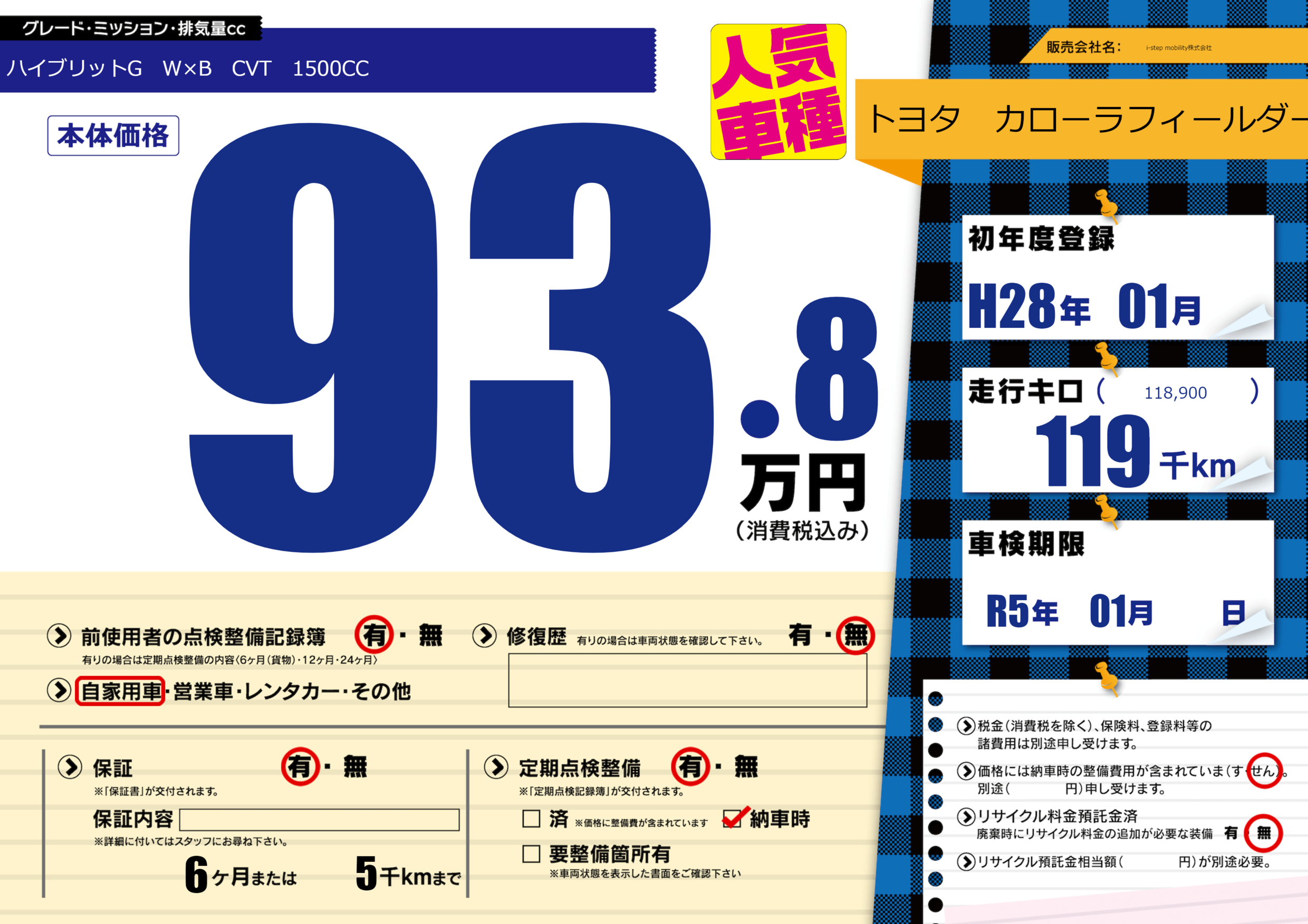 | 車名 | トヨタ カローラフィールダー | グレード ミッション 排気量 |