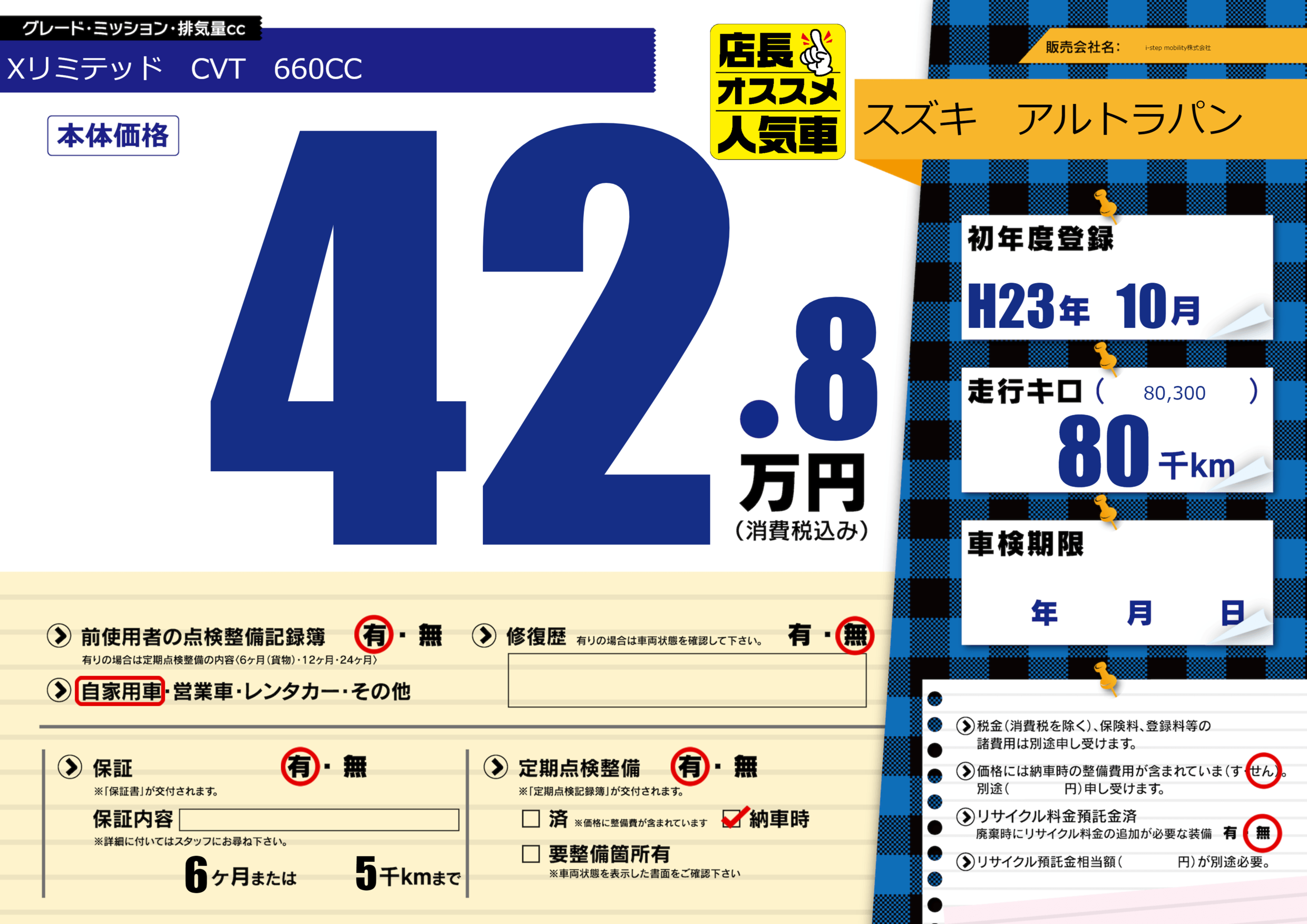 | 走行キロ | 8万km | 初年度登録 | H23年10月 |