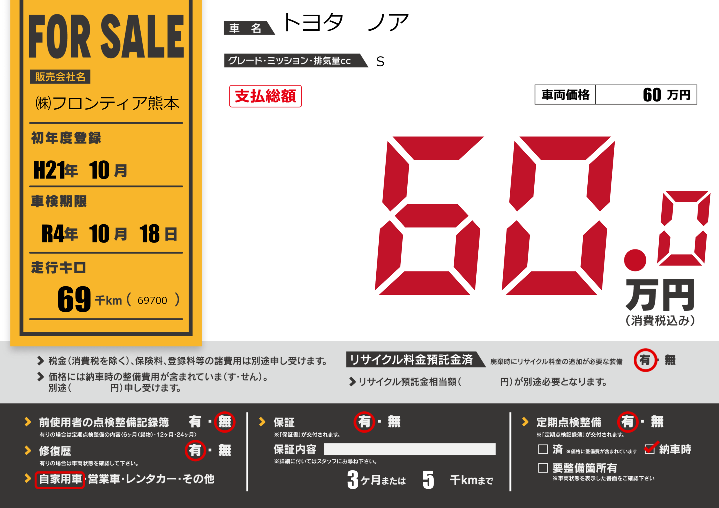 | 走行キロ | 6.9万km | 初年度登録 | H21年10月 |