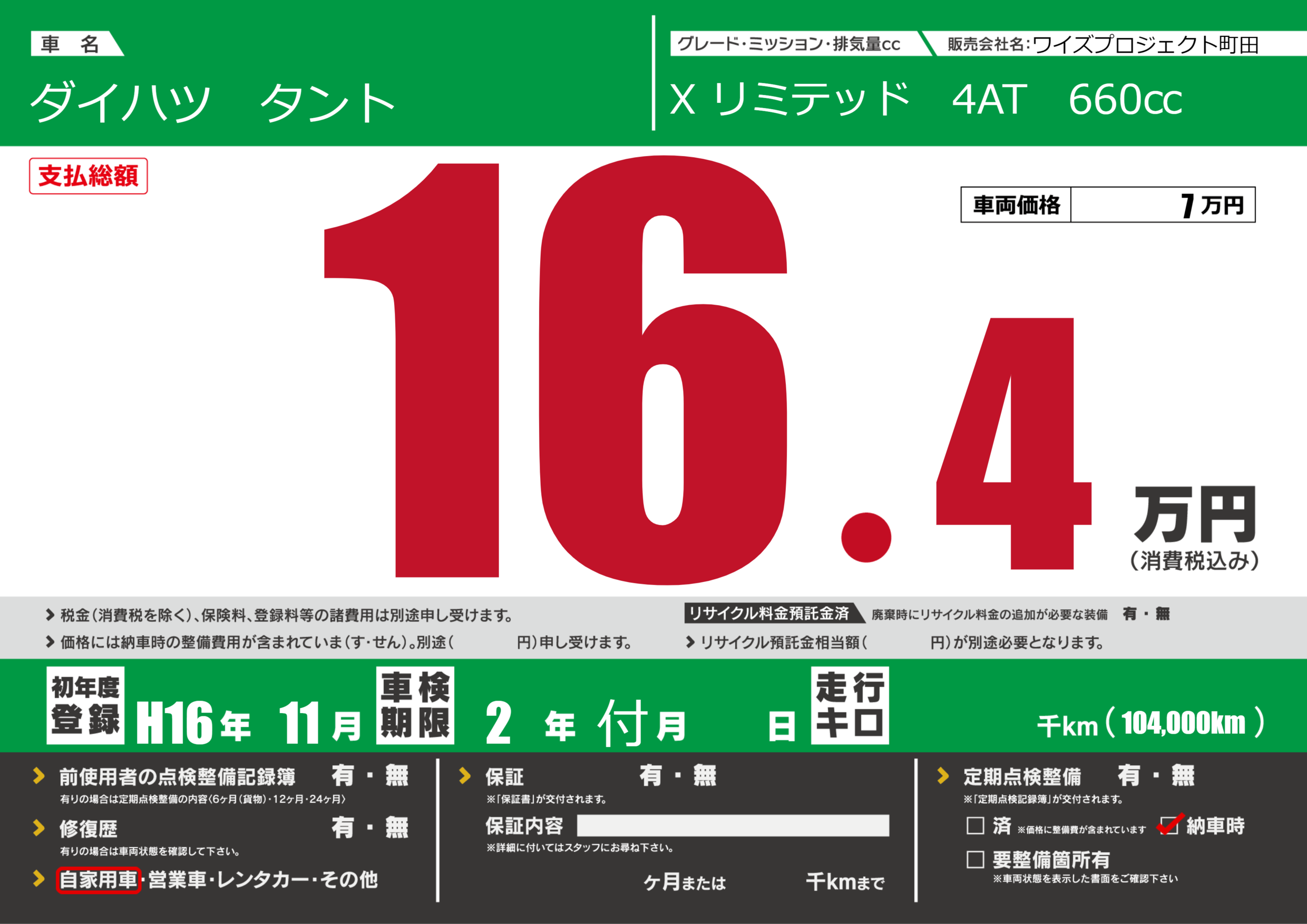 | 車名 | ダイハツ タント | グレード ミッション 排気量 |