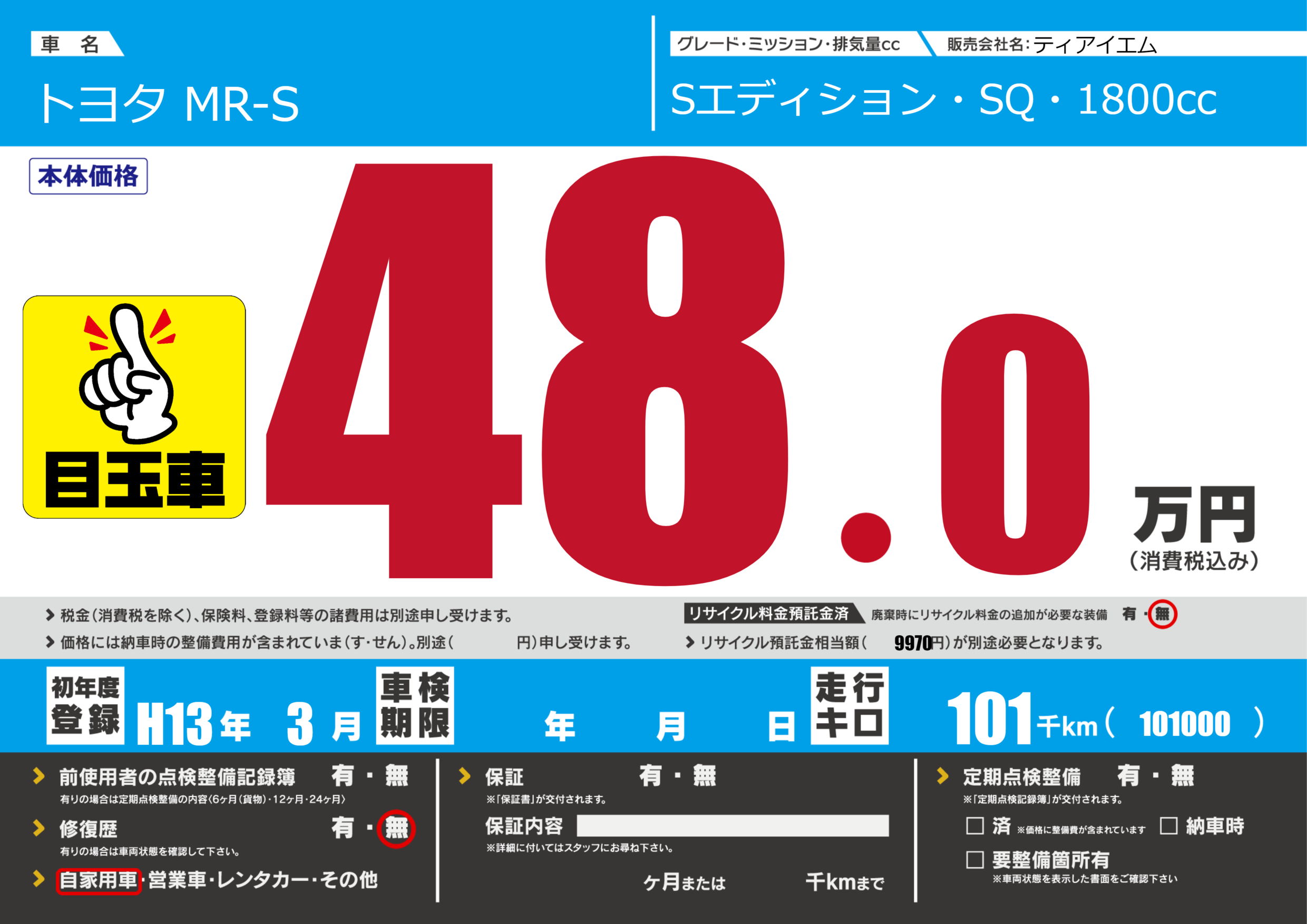 | 車名 | トヨタ MR-S | グレード ミッション 排気量 |