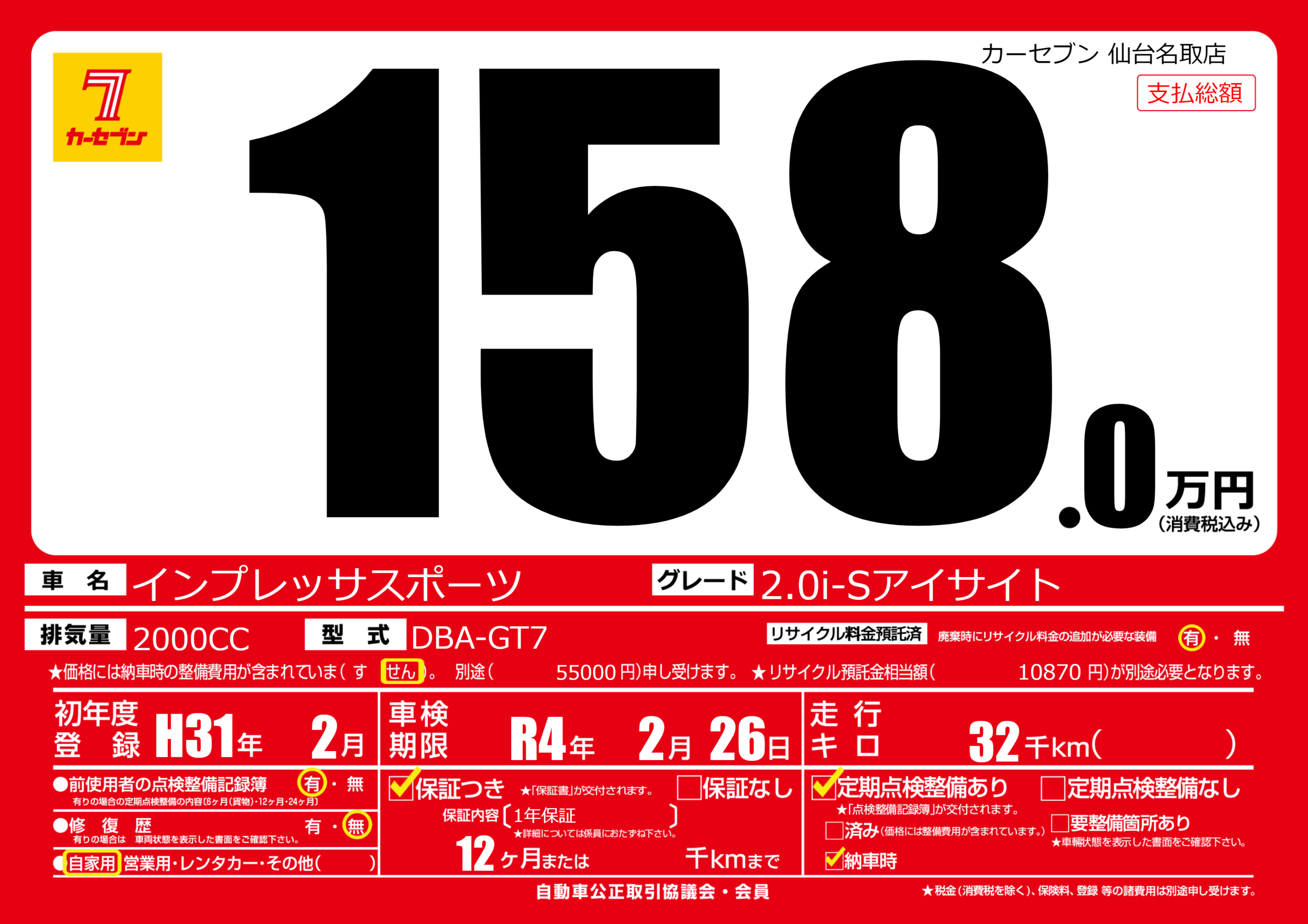 | 車名 | インプレッサスポーツ | グレード ミッション 排気量 |